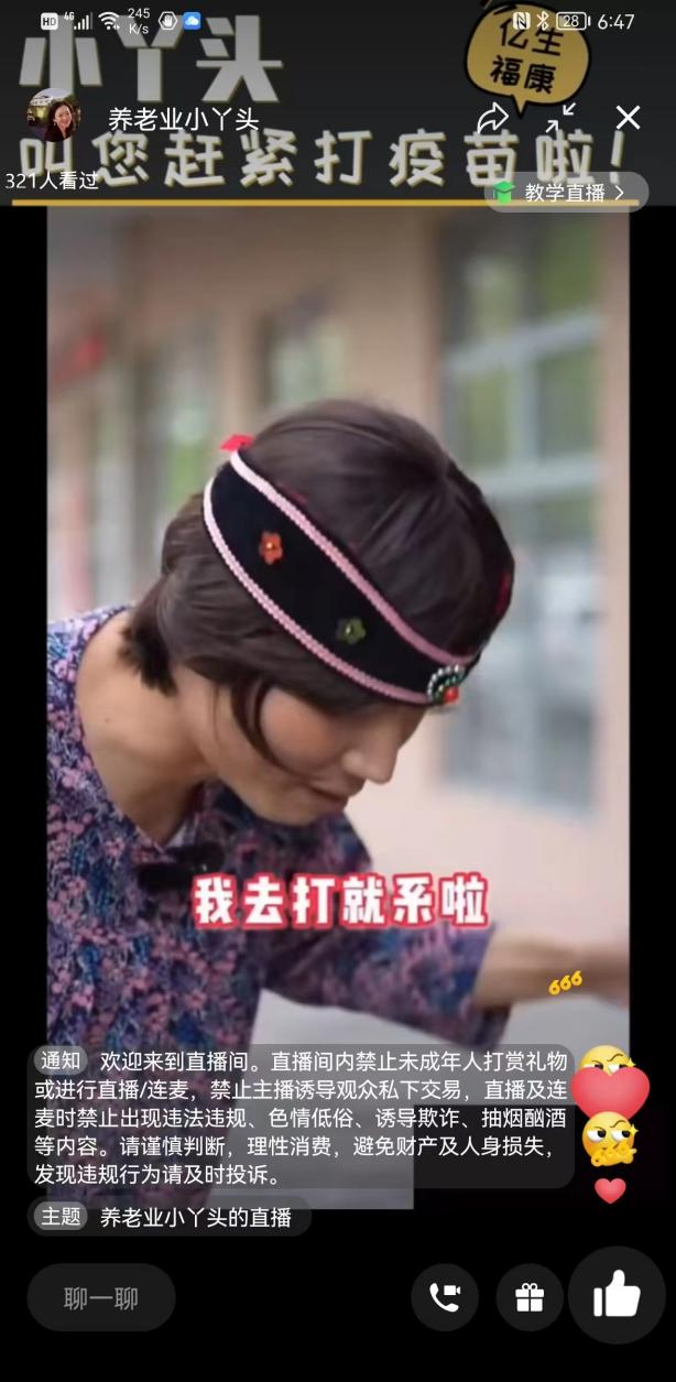 本活动围绕“新冠疫苗的重要性”、“新冠疫苗对于老年人的作用”、“身患慢性疾病能否接种?”、“老年人不出门是否就不会感染新冠病毒?”等主题,以动画、歌舞、情景剧等多种风格的呈现形式在直播平台展开。直播中,亿生福康医务人员运用专业知识讲述了新冠疫苗是通过何种形式作用于身体、为什么不会对身体造成危害等相关内容,以消除居民对接种新冠疫苗的戒备心理。此外,针对居民提出的老年人接种新冠疫苗的疑虑和问题,医务人员以身边事例入手,逐一进行详尽讲解,引导居民树立正确科学的疫苗接种观念,为避免给老年人带来生命威胁,给家庭和社会造成重大负担,建议老年人如果符合接种条件,按照“应接尽接”原则早接种、早保护。