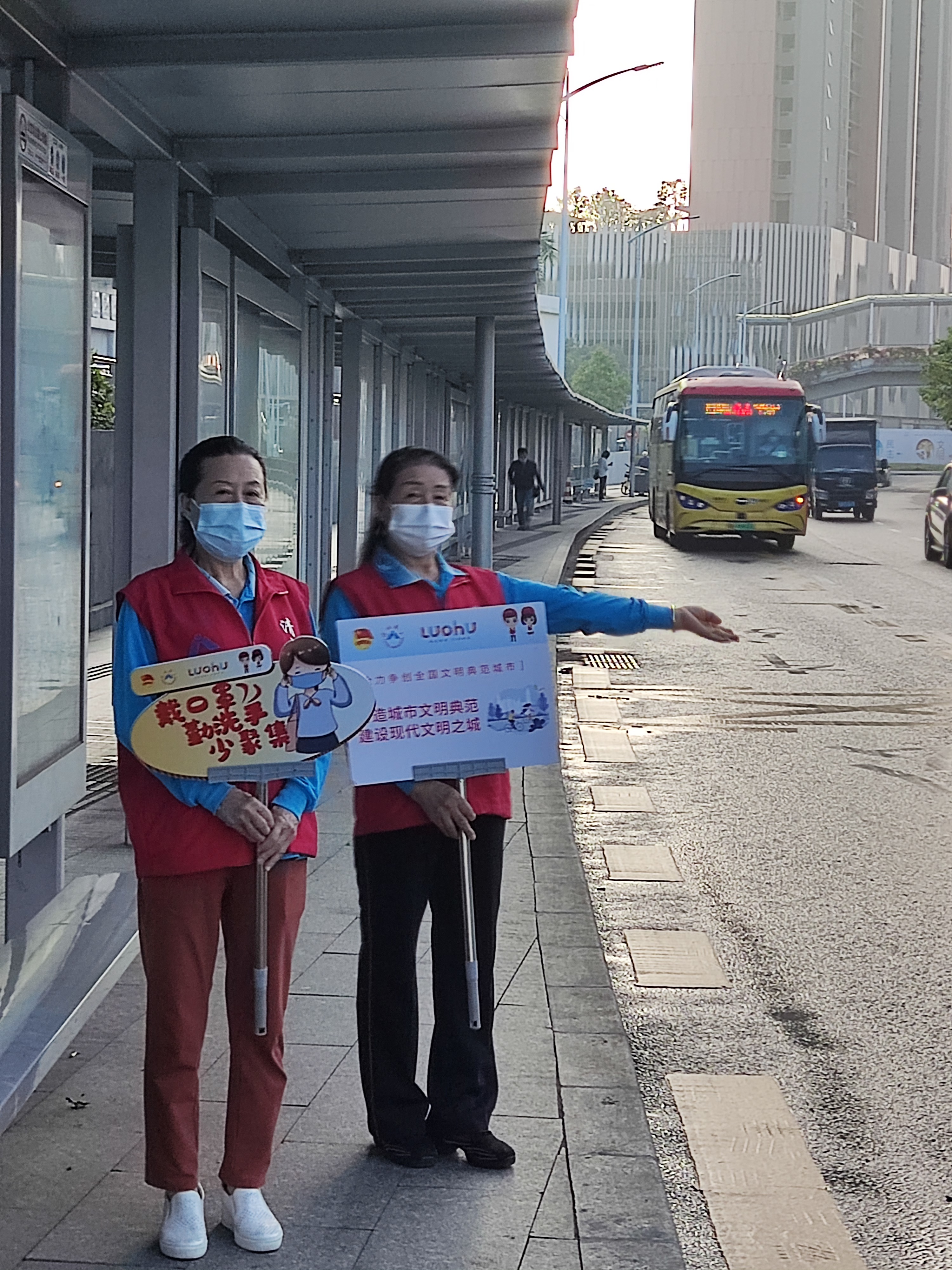 “您好,请正确佩戴好口罩,做好自我安全保护。”志愿者在银湖地铁口、公交站等人流量大场所举着“全民戴口罩”的宣传牌,向市民宣传疫情防控的重要性,倡导大家自觉佩戴口罩,养成科学规范佩戴口罩的文明好习惯。志愿者还对未佩戴口罩的群众及时劝阻,耐心地向他们讲解科学佩戴口罩的重要性。特别提醒市民进入公共场所扫场所码、测温等,积极做好个人防护。