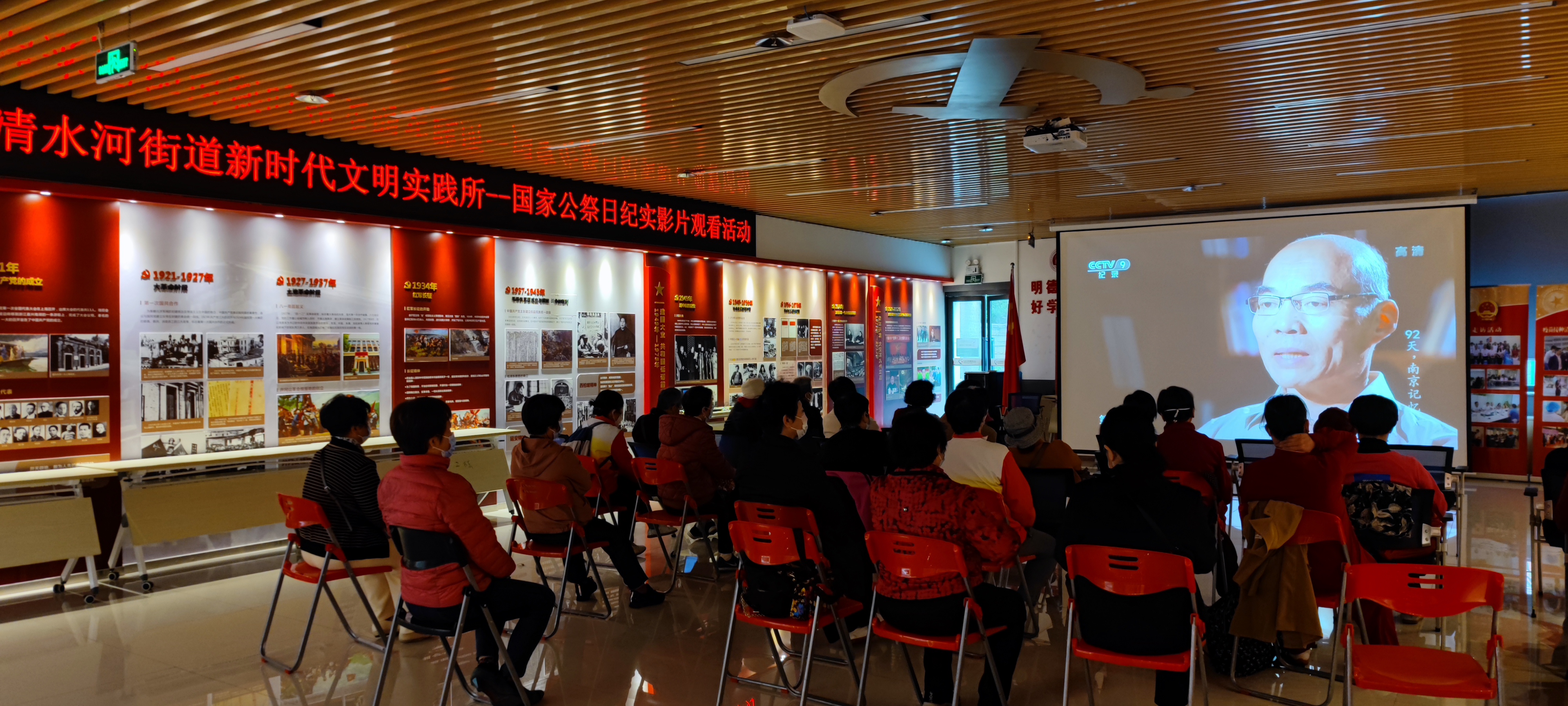 2022年12月13日是第九个南京大屠杀死难者国家公祭日。为深入贯彻落实党的二十大精神和习近平总书记关于加强全民国防教育的重要指示精神,12月13日下午,银湖社区新时代文明实践站组织开展“铭记历史·勿忘国耻”国家公祭日主题观影活动,组织社区工作人员,东西方社工银湖服务中心,党员志愿者,清水河U站志愿者等共40多人观看爱国主义教育纪实片《南京记忆》。