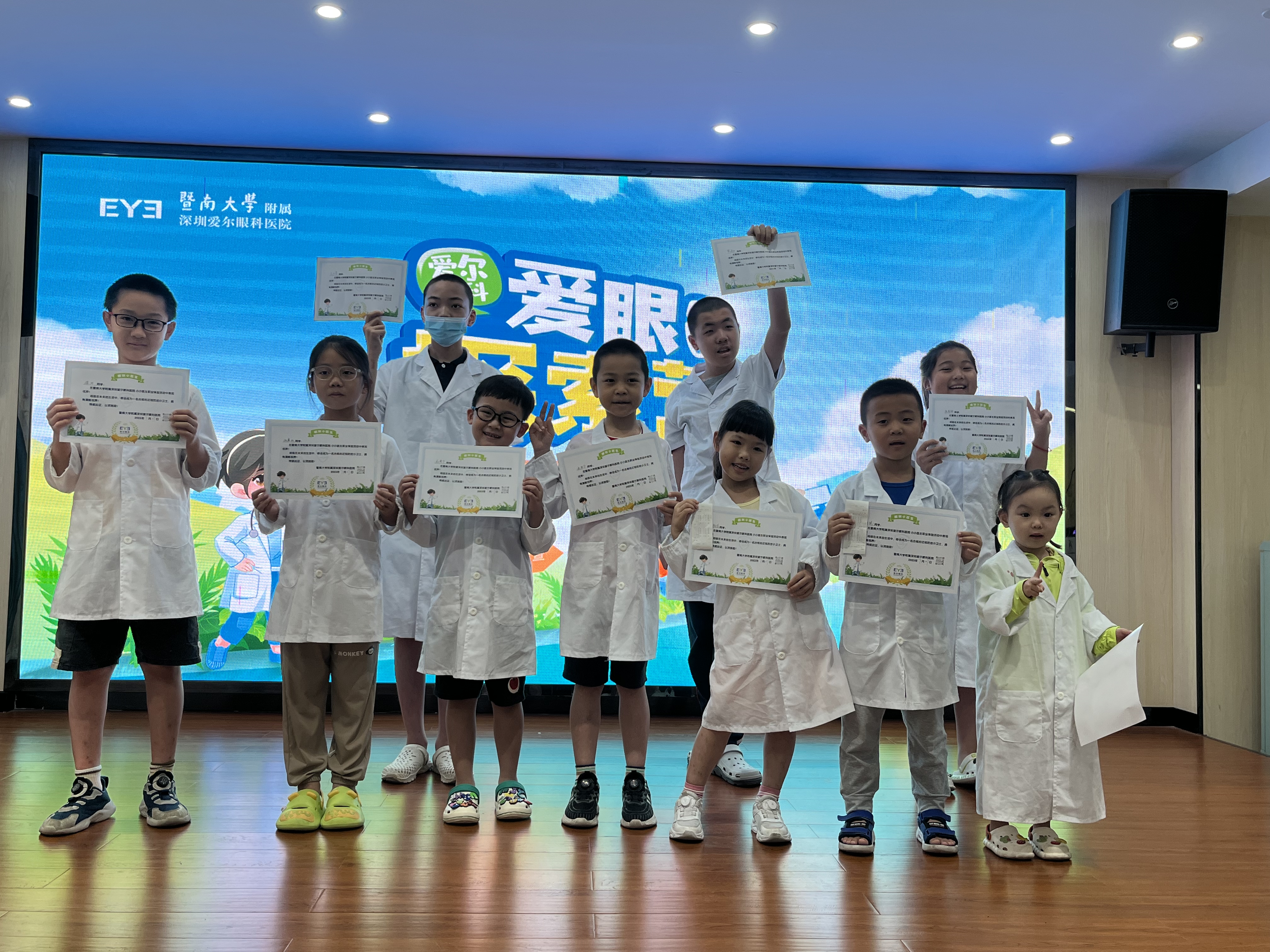 紧接着就是小朋友们期待的“我是小小医生”职业体验环节了。在专业医生的指导和帮助下,大家认真学习了视力检查项目,“小小医生”开始上岗啦!他们分别充当医生与患者的角色,相互检测视力,虽说操作起来都不太熟练,但却十分认真。经过一上午的学习体验,小小医生们表现得都很出色,爱尔眼科医生为他们颁发了“眼科小医生”证书。看,他们多开心呀!