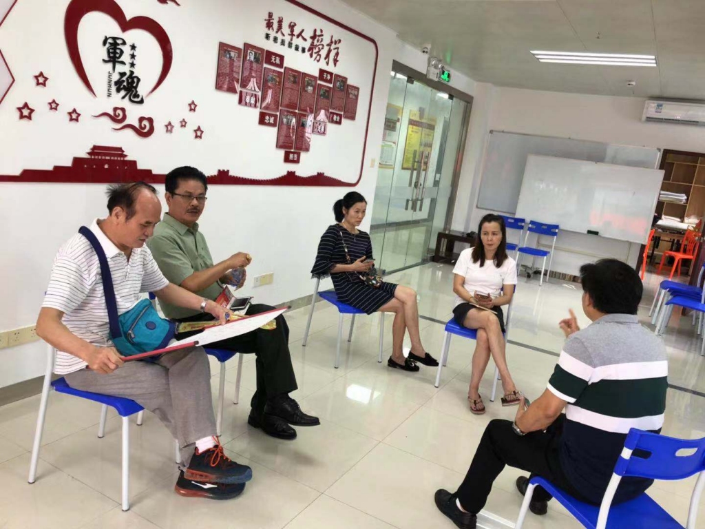 洪湖居委会主任与老兵说画项目的老师、志愿者、党群社工主任商讨项目开展事宜。