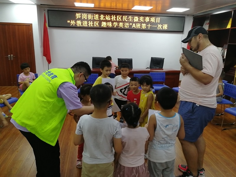 2019年8月12日下午,笋岗街道北站社区开展了民生微实事项目“外教进社区趣味学英语”A、B班第十一次课(A班5-7岁14:20-16:10,B班8-12岁16:30-18:00)。