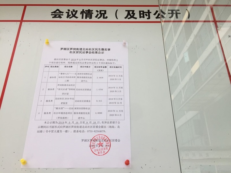 2019年9月16日,北站社区召开居民议事会,审议2019年民生微实事第二批服务类项目,并将结果公示。