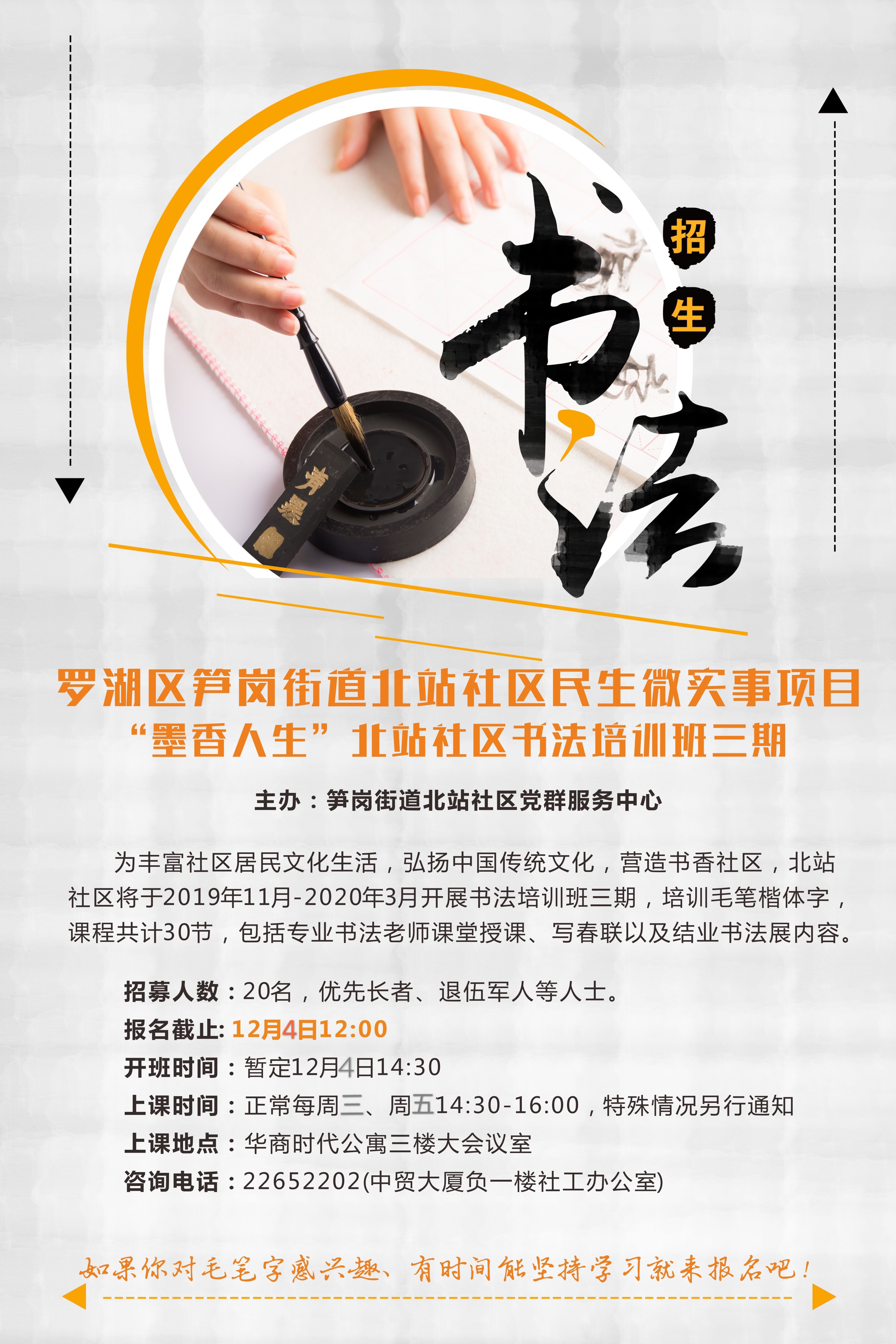 罗湖区笋岗街道北站社区民生微实事项目“墨香人生”北站社区书法培训班三期 开始招生啦