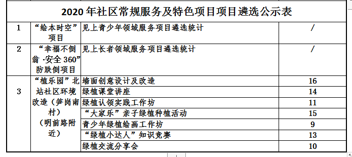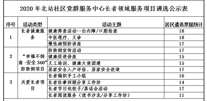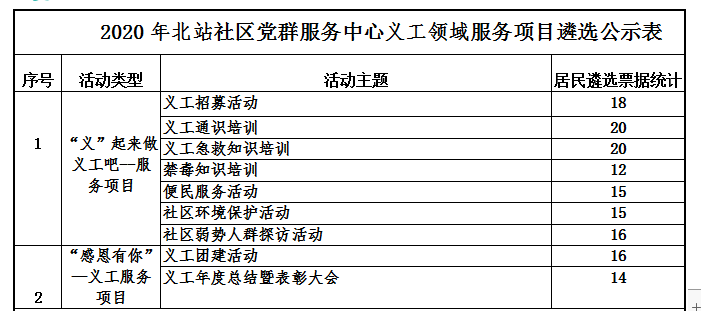 为了更好地了解社区居民的实际需求,规划2020年度的服务方向和内容,北站社区党群服务中心开展了2020年服务项目遴选会,北站社区党委、居委会、社区居民议事员及社区社会组织代表共29人参与了此次的服务项目遴选会并对中心的服务项目进行遴选投票,共分发21份服务项目遴选表,有效回收了21份服务项目遴选表,现将服务项目遴选结果进行公示。公示期自即日起5个工作日,即1月19日—1月31日,社区居民可随时进行监督,并提出宝贵的意见及建议。咨询电话:0755-22652202。