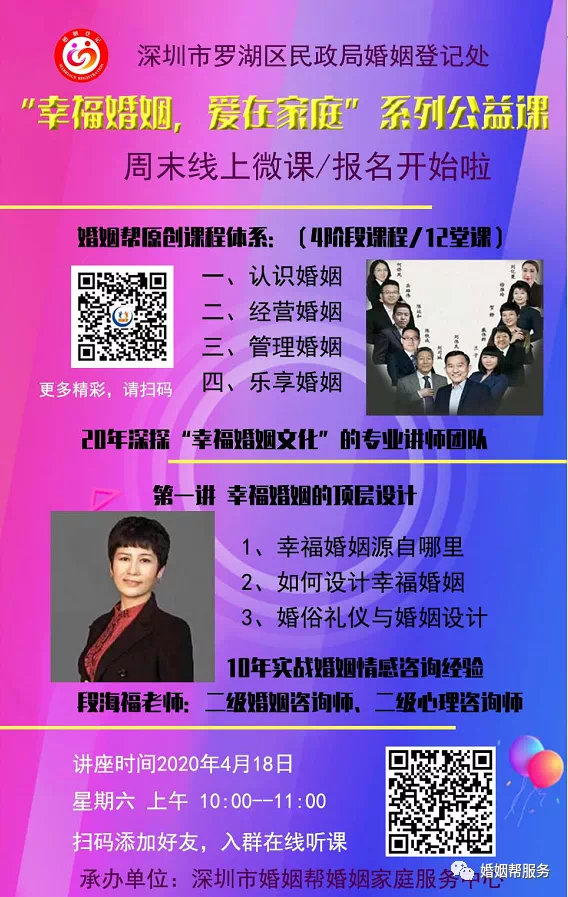 通知:罗湖区民政局婚姻姻登记处邀请专业讲师团队,在区婚姻登记处、各街道办事处、社区通过线上开展“婚前、婚中、婚后”系列婚姻知识讲座,给希望提升幸福指数的市民群众提供成长、交流平台,也给有情感困惑的市民群众带来温暖与帮助。《婚姻导航》婚姻家庭辅导讲座第一课即将开始,️需要的朋友可以扫码报名。