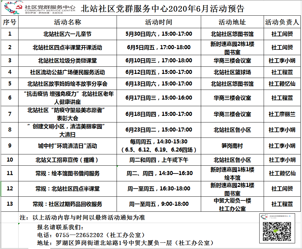 北站社区党群服务中心2020年6月活动预告