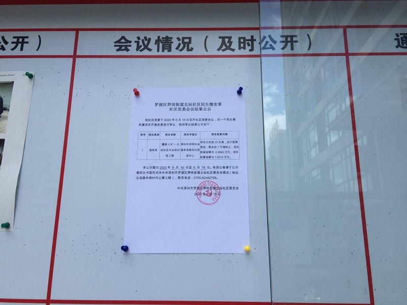 2020年6月15日北站社区召开社区党委会议,对一个民生微实事项目开展变更进行审议,并将审议结果张贴在社区党务居务公开栏中公示。