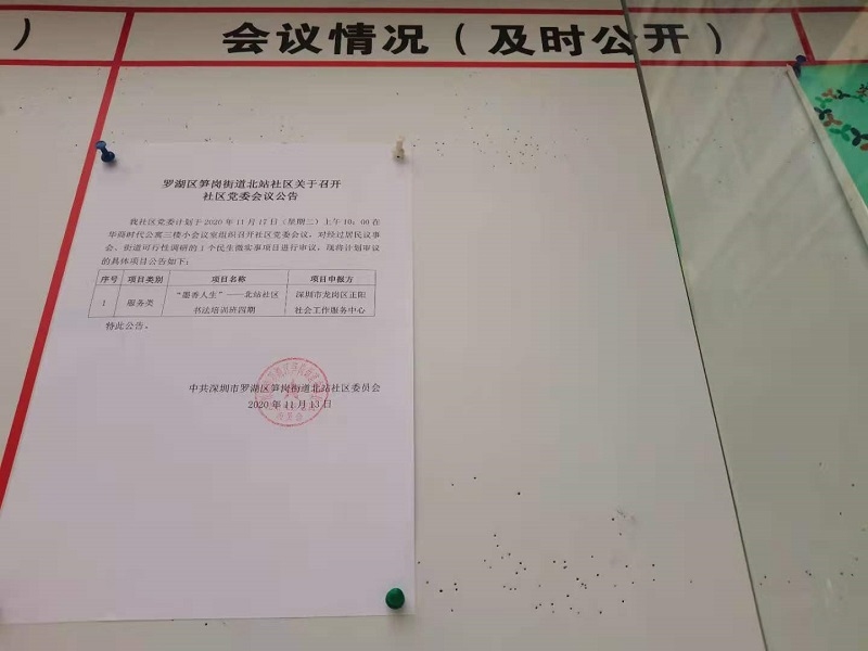 北站社区定于2020年11月17日开社区党委会议,审议2020年民生微实事第二批服务类项目,并将会议公告张贴在社区党务居务公开栏中。