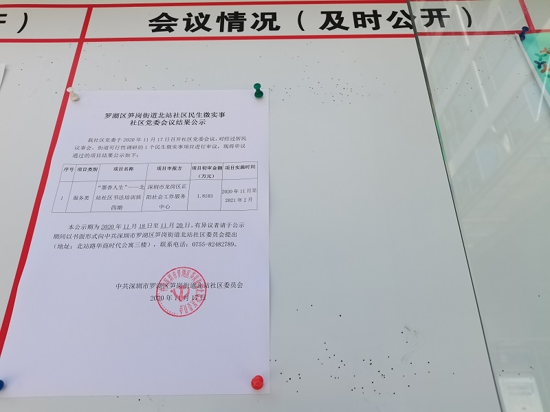 北站社区党委会议审议第二批民生微实事服务类项目结果公示,并张贴在社区党务居务公开栏中。