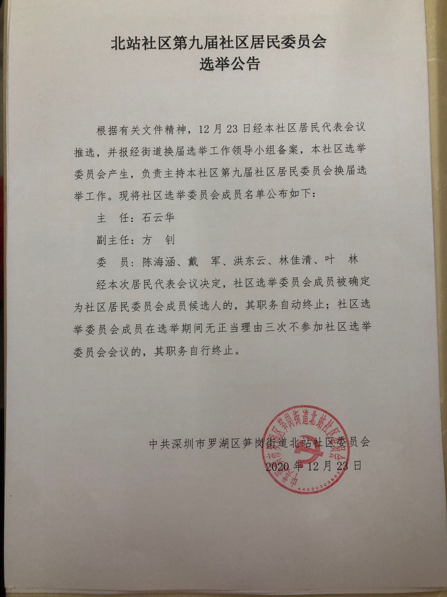 北站社区第九届社区居民委员会选举公告