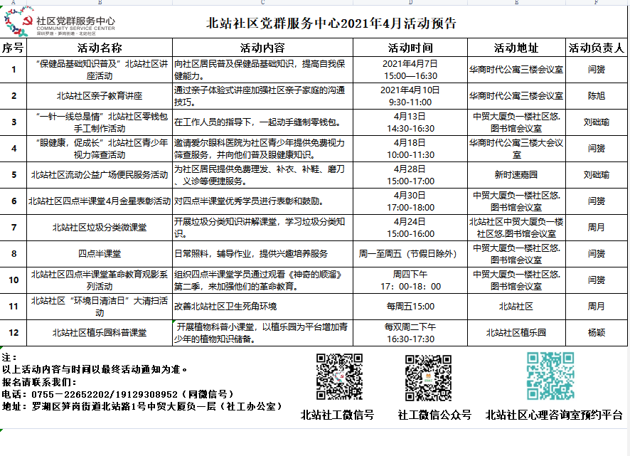 北站社区党群服务中心2021年4月活动预告