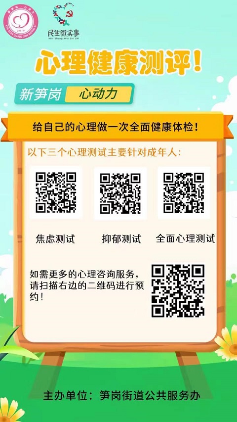 “新笋岗心动力”心理健康测评邀您一起参与,在线扫码即可测评,根据测试结果和自身需求,可扫码预约心理咨询师进行专业分析