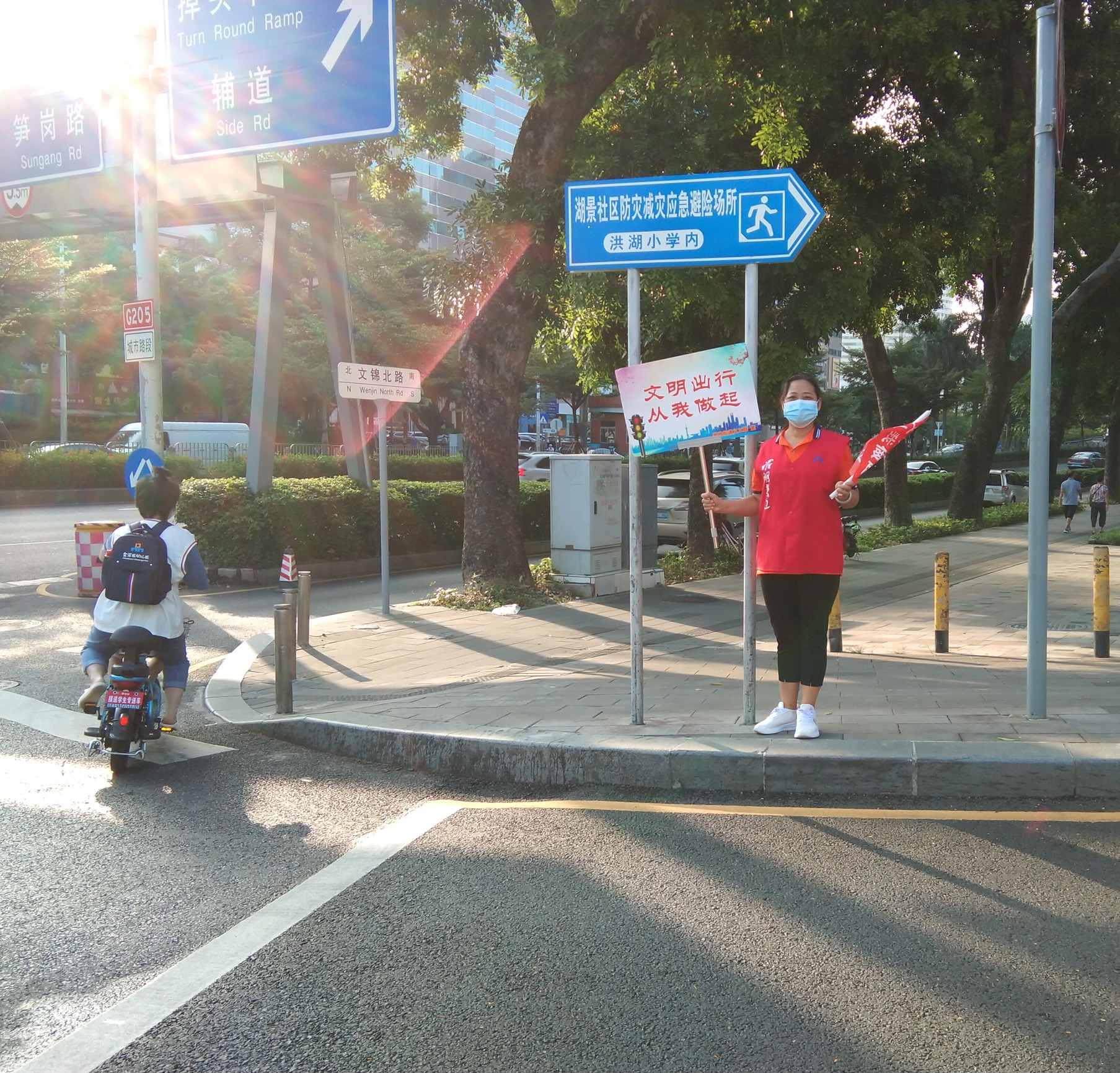 为迎接第六届全国文明城市检查,营造良好的文明交通氛围。2020年9月25日,志愿者在湖景社区管辖的红绿灯路口,湖景社区开展创建文明交通劝导志愿服务活动。