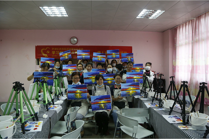 在学习面前,不分年龄,部分年长的女性居民也仿佛回到学生时代,认真地学着一笔一划给自己作品上色,遇到不清楚的地方积极地向老师提问,很认真地完成每一个步骤。