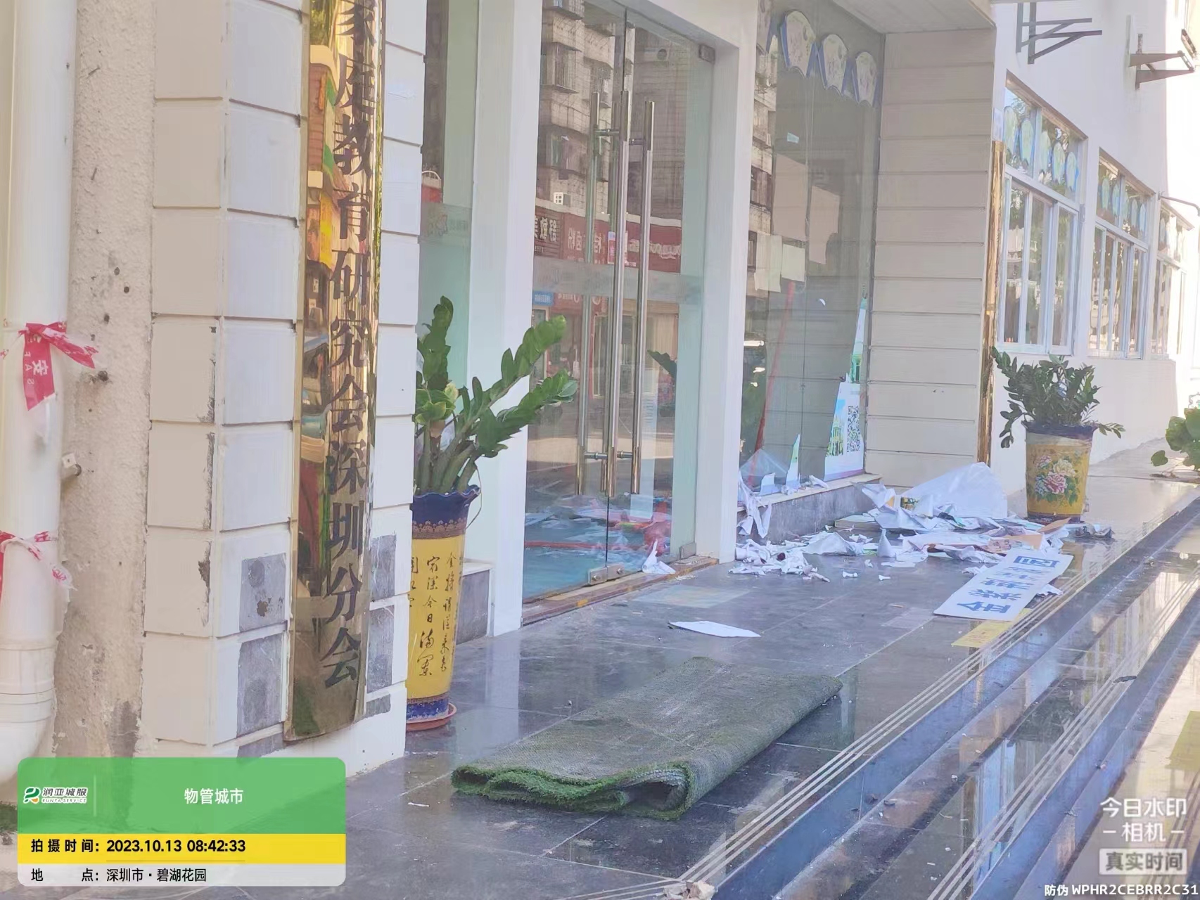 2023年10月13日上午,润亚城服对湖景社区工作站附近居民小区进行卫生巡查,清除卫生死角,打扫废弃垃圾,创造干净卫生居民环境。