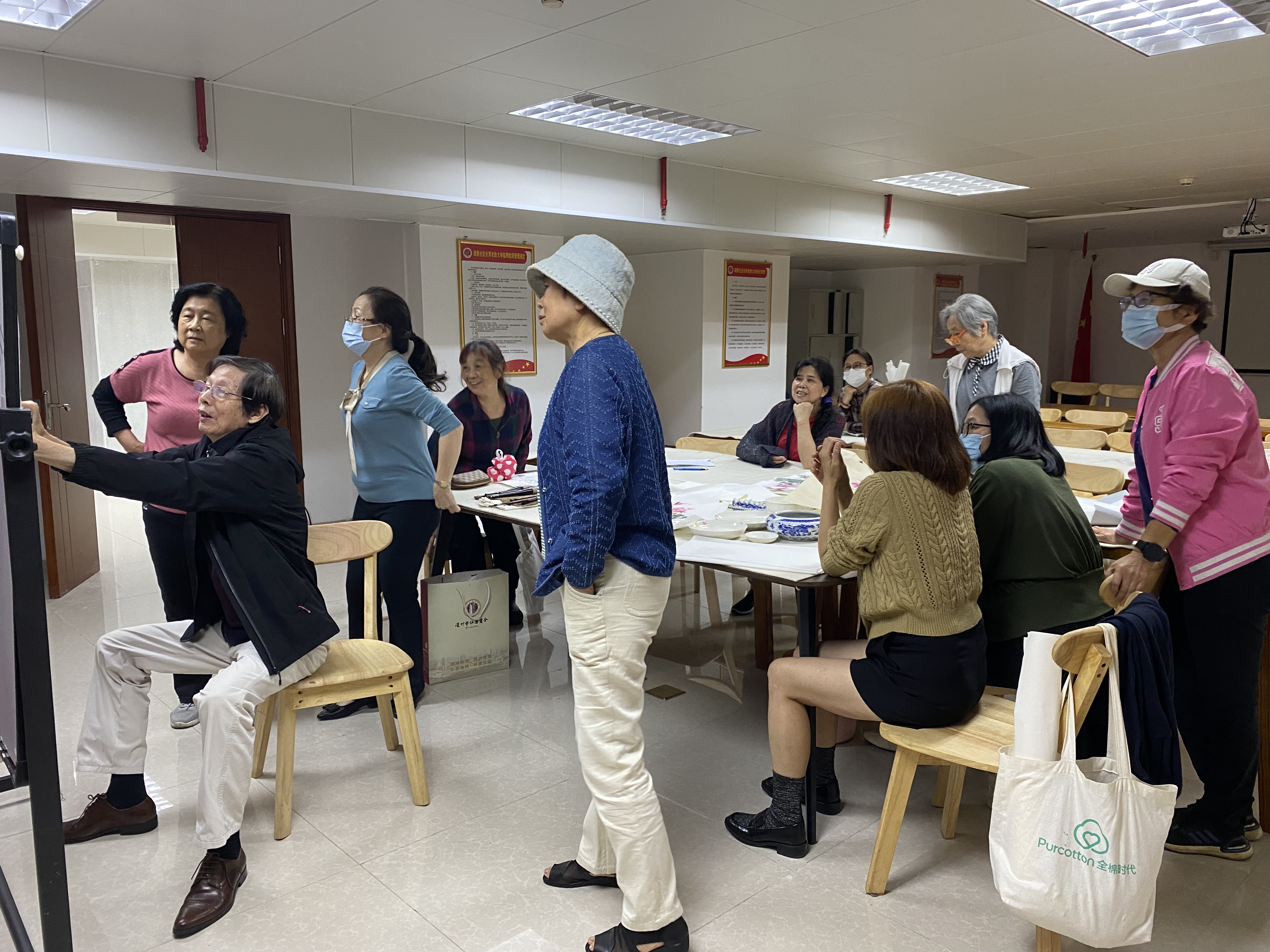 2023年12月1日下午,湖景社区老年人国画班正常开课。授课老师黄老师先为每个学员上一次的作业——牡丹和菊花进行了点评,一起交流沟通,然后就个别存在问题进行详细讲解。然后开始教授新课,黄老师首先给学员们充实加强了对牡丹叶子组织结构的认识与用笔示范,接着用墨色与色彩分别画小样,学员们都积极地进行练习,挥毫书写,课堂气氛一片热闹。