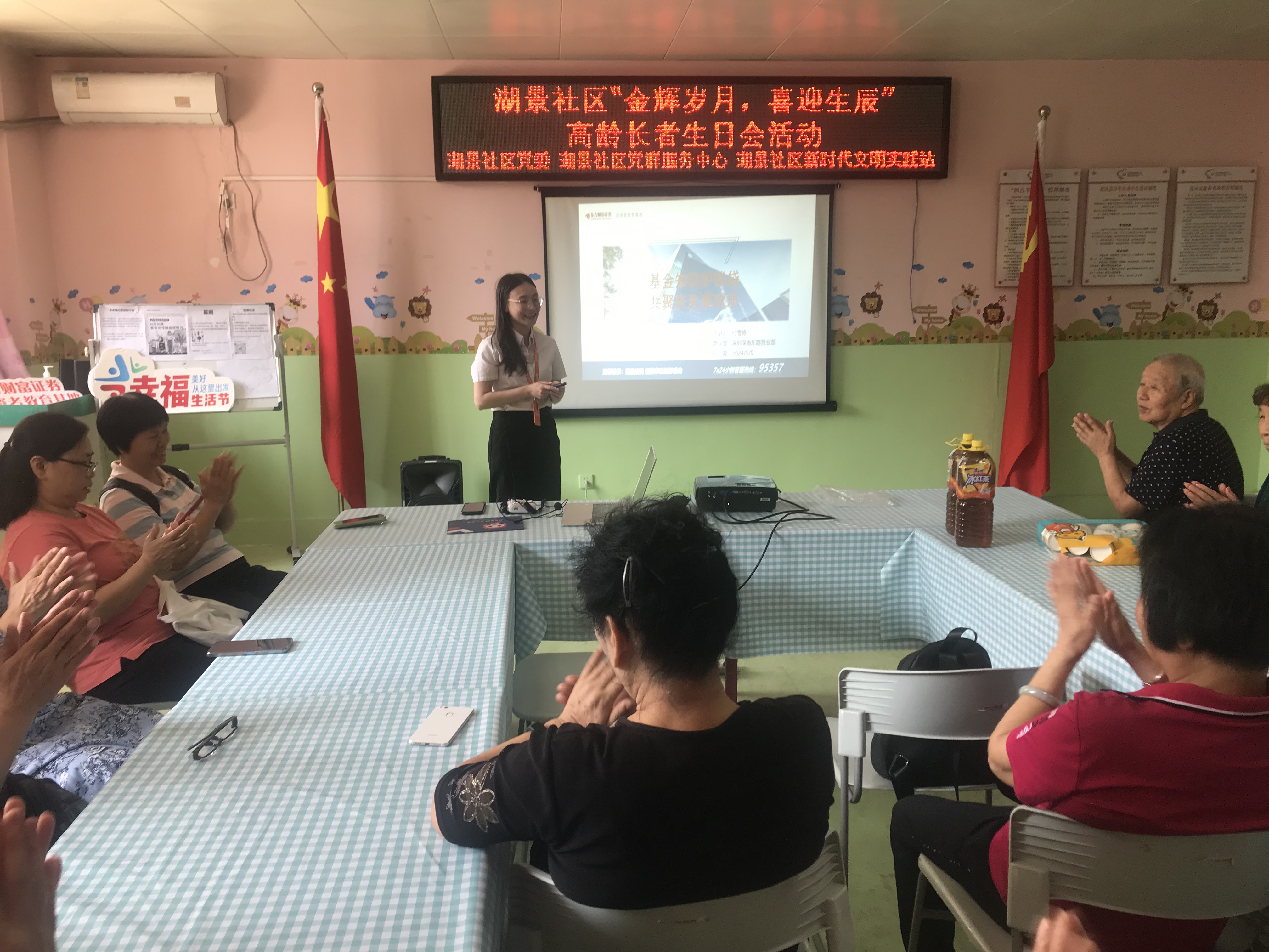 为了深入传承和弘扬中华民族尊老敬老的传统美德,向社区长者表达敬意和关爱,5月9日上午,在湖景社区党委指导下、湖景社区党群服务中心、湖景社区新时代文明实践站驻点北斗社工联合东方财富证券投资者教育基地开展了湖景社区“金辉岁月,喜迎生辰” 高龄长者生日会活动,共有13位长者参与。