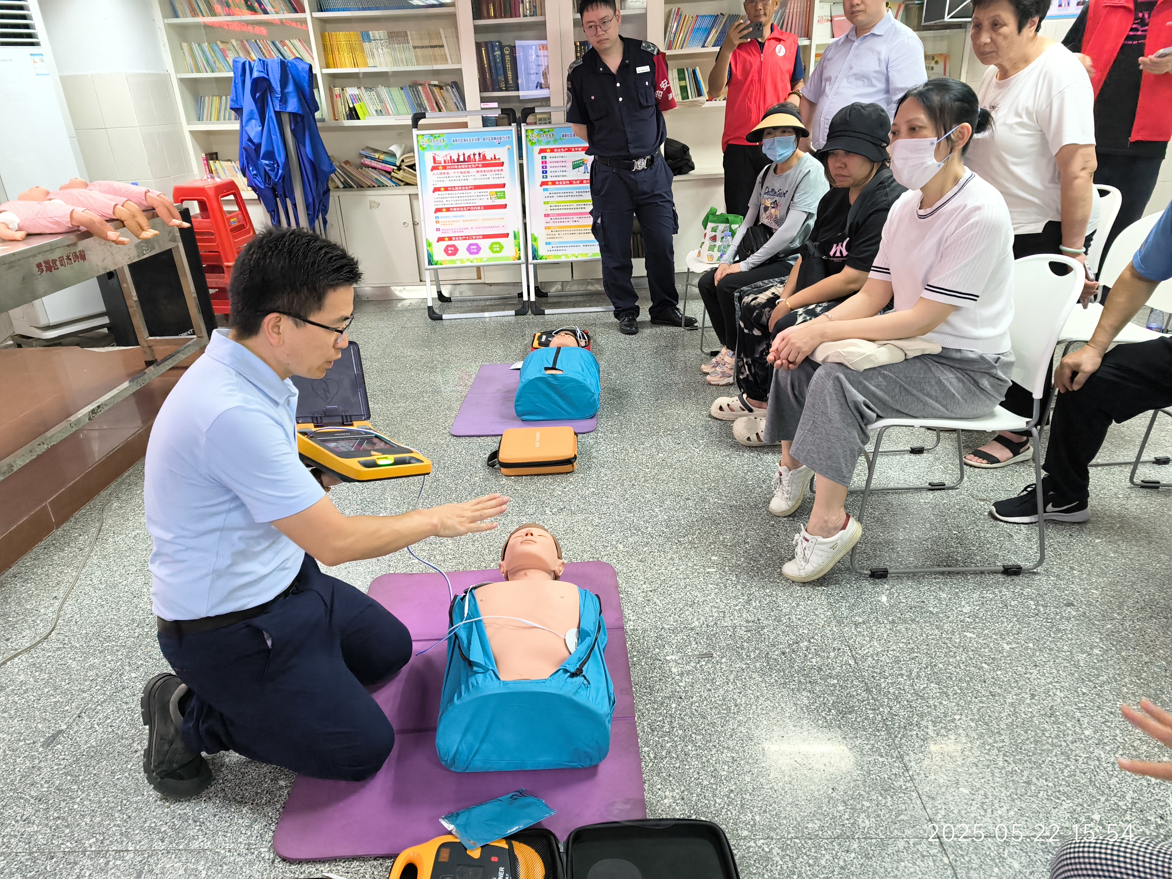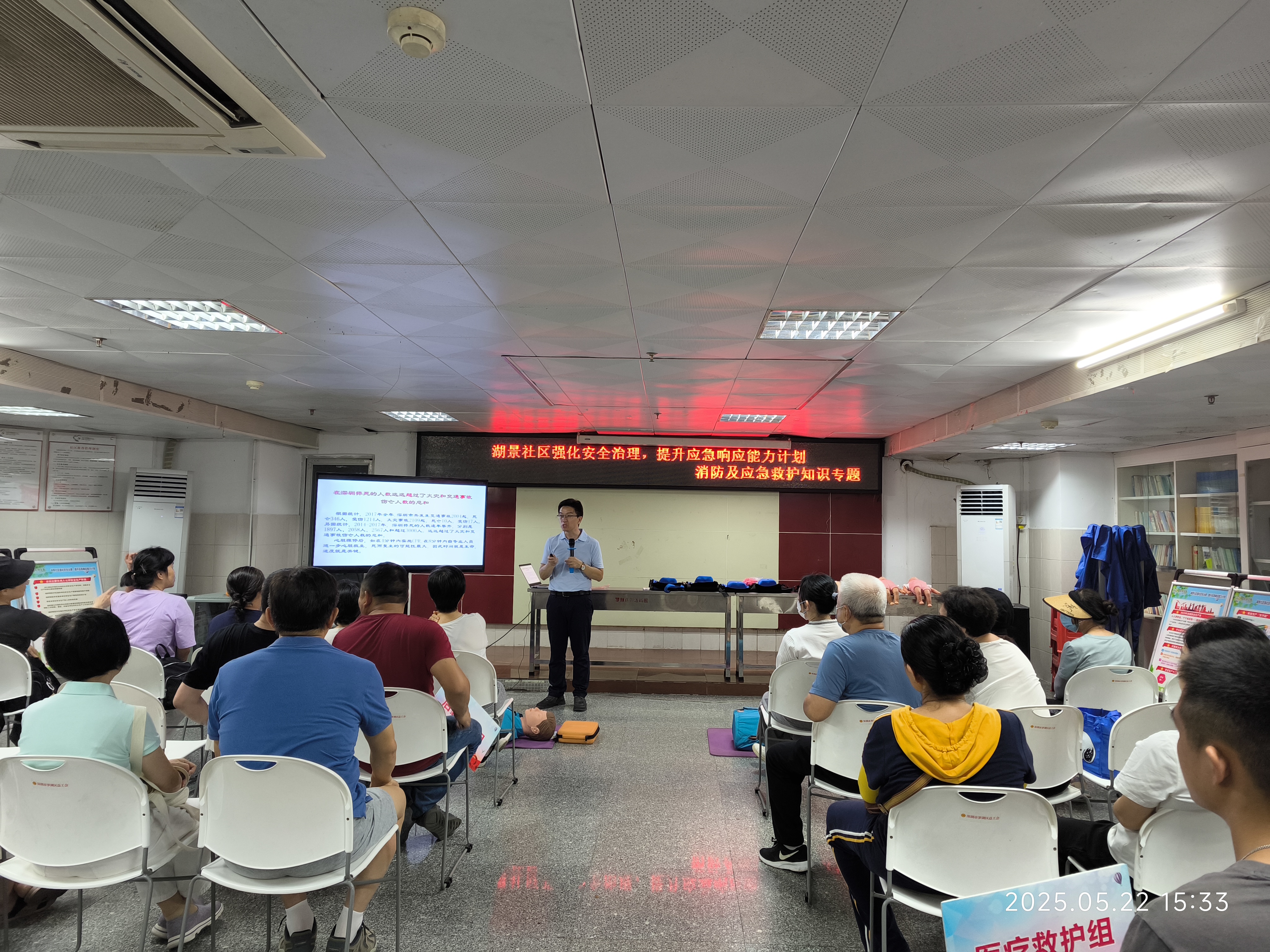 为深入贯彻落实安全生产相关法规要求,全面提升辖区居民安全应急处置能力,2025年5月22日下午,在湖景社区党委指导下,湖景社区党群服务中心、湖景社区新时代文明实践站驻点北斗社工开展了一场多元化的消防及应急救护知识专题培训。此次活动共吸引湖景社区50名辖区居民积极踊跃参与,共同为织密社区安全应急赋能。