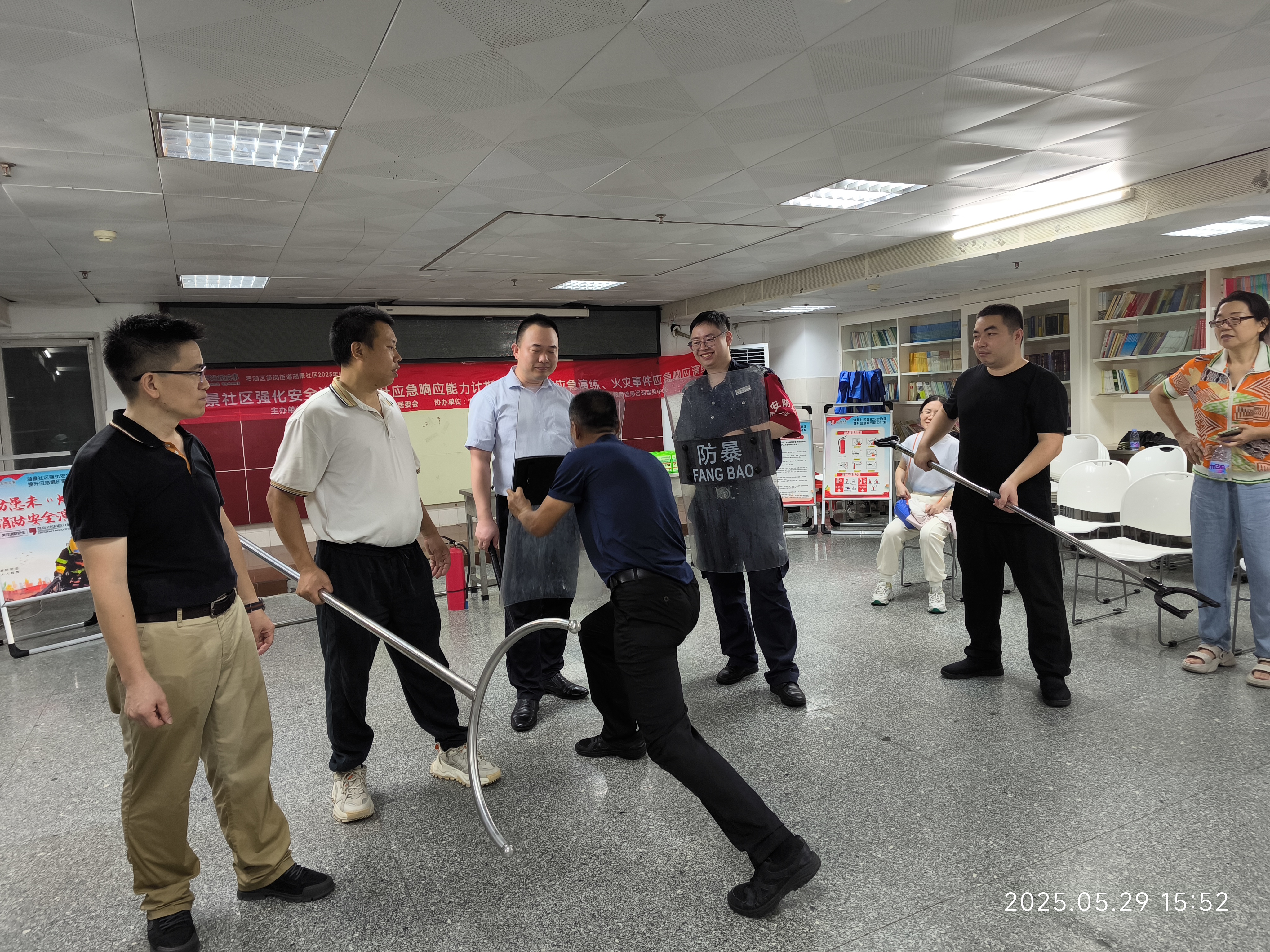 为切实提升辖区物业从业人员和居民应对突发冲突、火灾事件,检验多方协作应对突发事件的应急能力,确保社区环境的安全稳定。2025年5月29日下午,在湖景社区党委指导下,湖景社区党群服务中心、湖景社区新时代文明实践站驻点北斗社工,在洪湖花园篮球场顺利开展一场涵盖防暴反恐、火灾事件应急等多场景的实战化演练。以练促防、以演筑安,为社区安全管理注入强心剂。此次活动参与人员包括湖景社区物业人员及辖区居民共50位,为湖景社区的安全建设增添了坚实的保障。