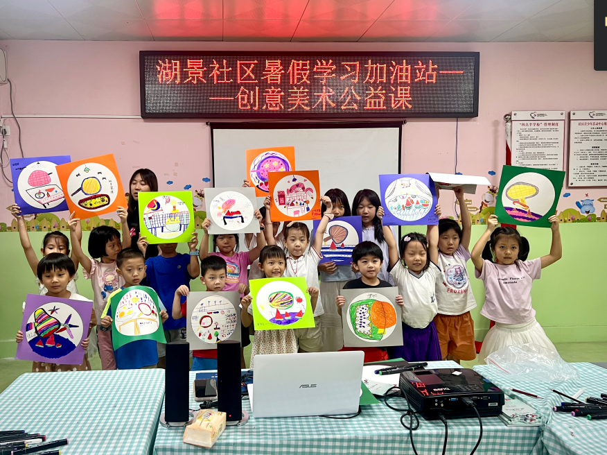 2025年8月25日至29日下午,在湖景社区党委的指导下,湖景社区党群服务中心,深圳市北斗社会工作服务中心邀请壹手好字联合开展了‘湖景社区暑假学习加油站—创意美术公益课’活动。22 名社区儿童欢聚一堂,在画笔与色彩的世界里度过了一段充实又欢乐的时光。