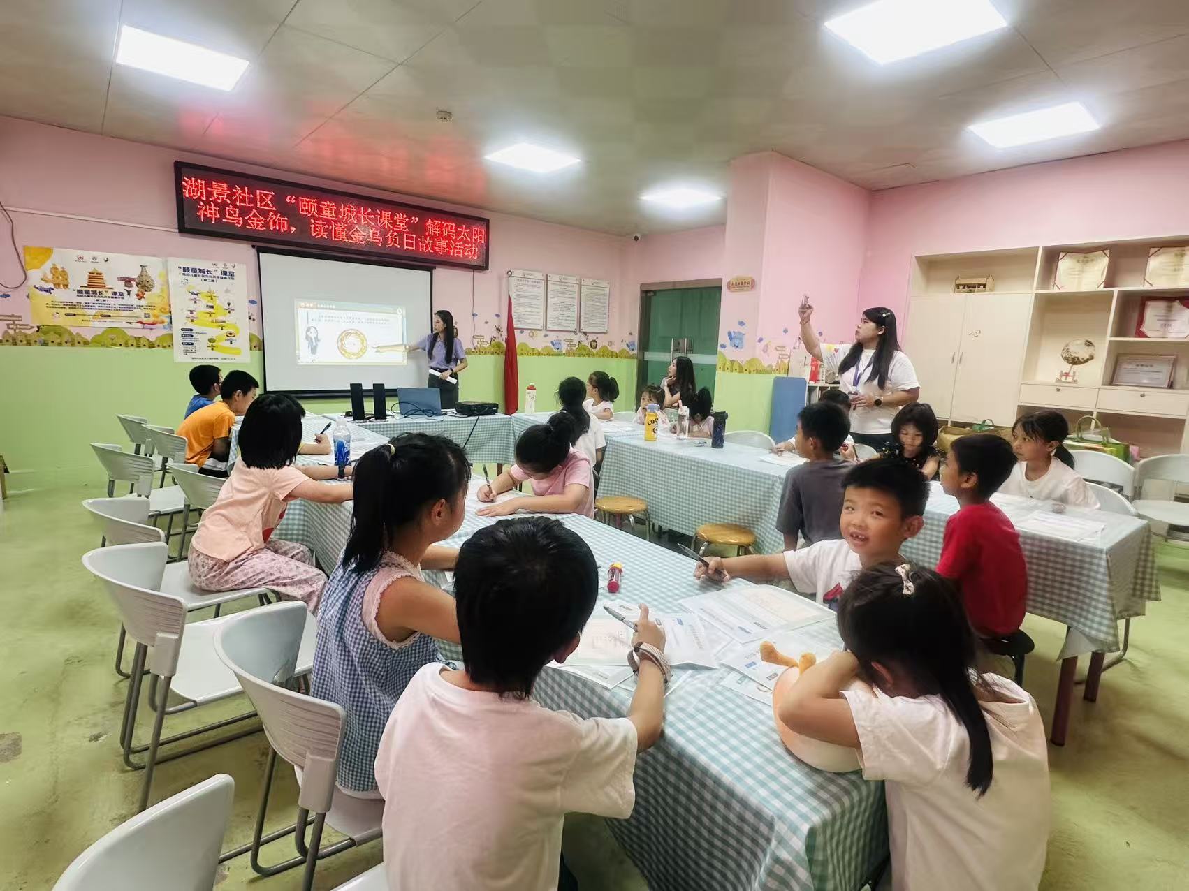 2025年10月19日下午,在湖景社区党委的指导下,湖景社区党群服务中心,深圳市北斗社会工作服务中心联合深圳市未保开展了一场湖景社区“颐童城长课堂”解码太阳神鸟金饰,读懂金乌负日故事活动。邀请了专业老师带领孩子们走进古老的神话世界,探索太阳的奥秘,用创意画笔为太阳献上专属礼物,让孩子们在欢乐中收获知识与成长。共吸引18位社区儿童参与。