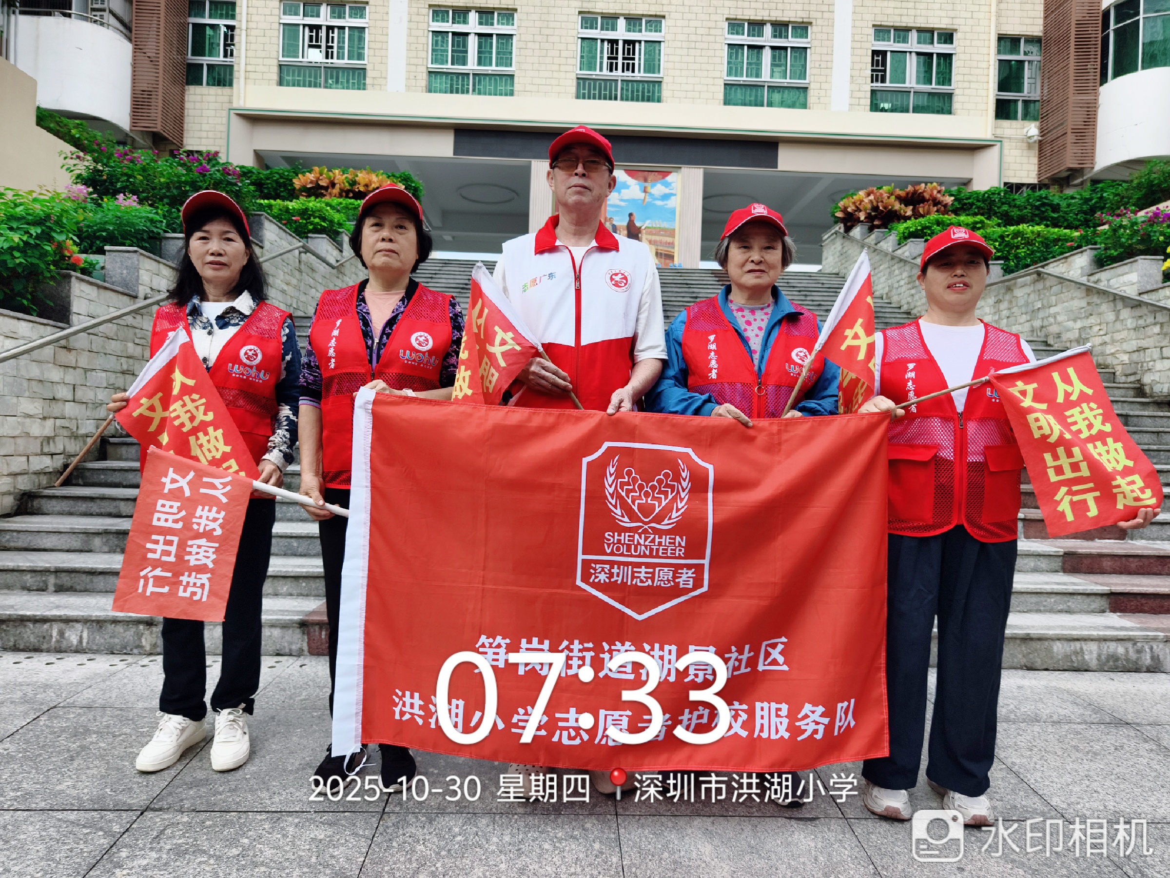 此次早间交通指挥志愿服务,在湖景社区党委的指导下,湖景社区党群服务中心联合洪湖小学开展了早间交通指挥志愿服务活动,活动聚焦学校周边交通拥堵难题,以 “护学安全” 为核心,用志愿力量为学生上下学筑起一道安全屏障。