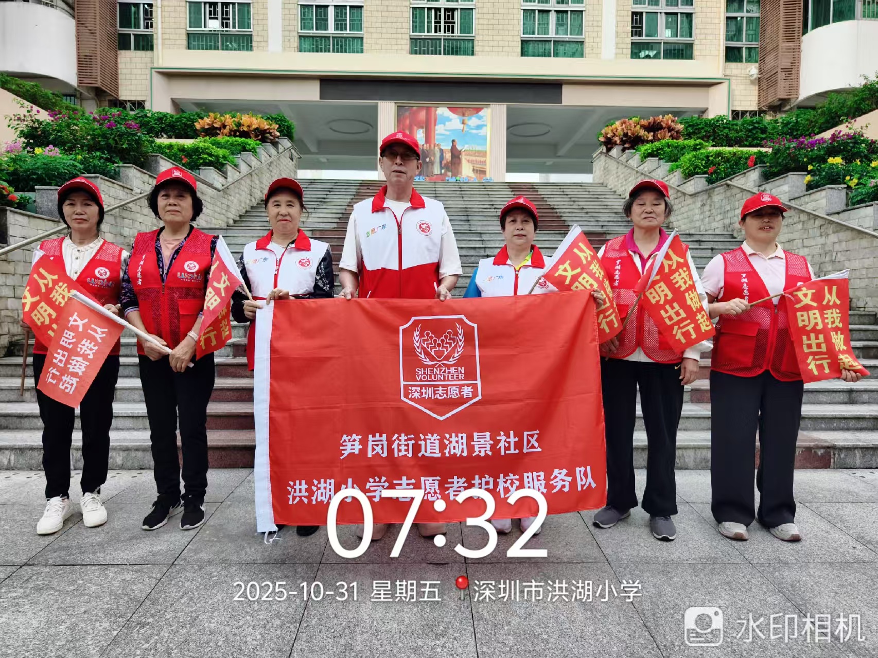 清晨微光初绽,洪湖小学门口已跃动起一抹抹亮眼的 “中国红”。身着红马甲的志愿者们早早到位,或引导车流,或护送孩童,成为校门口最温暖的风景线。