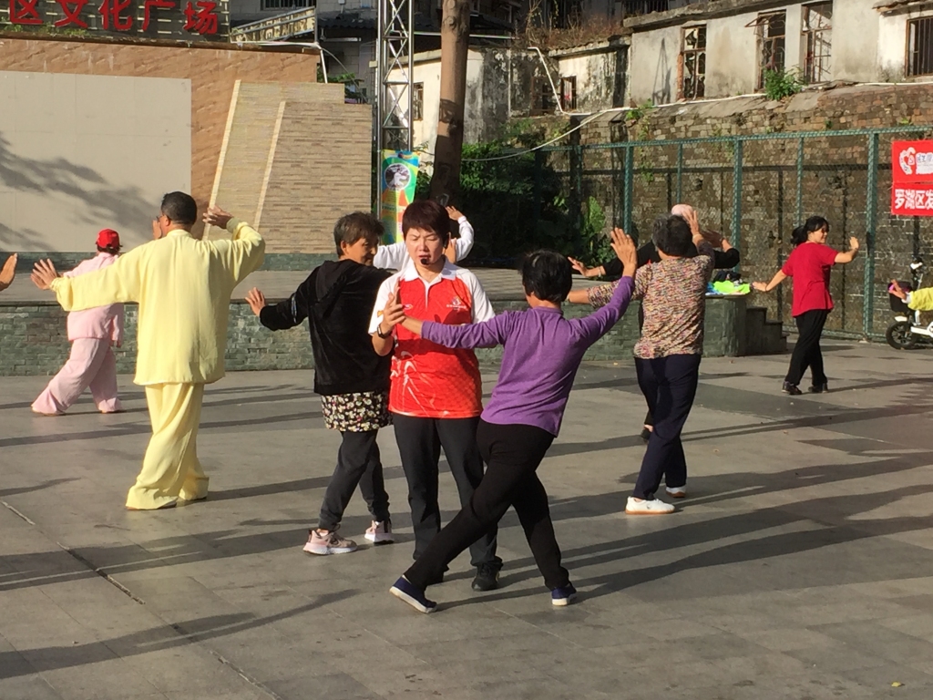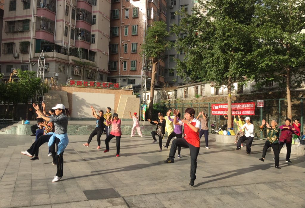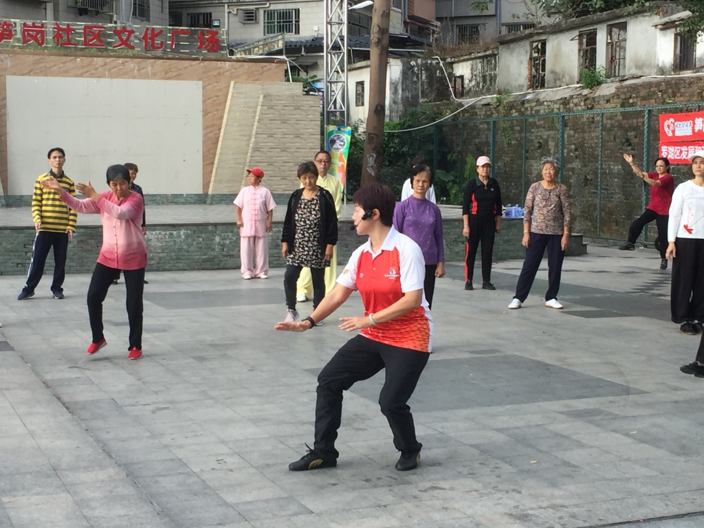 11月17日笋岗社区太极公益课,王老师和学员们早早的来到文化广场,进行课前热身。