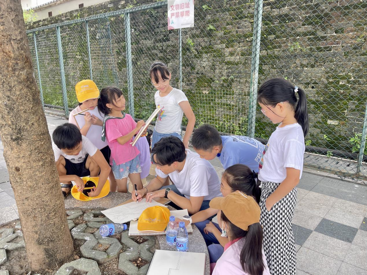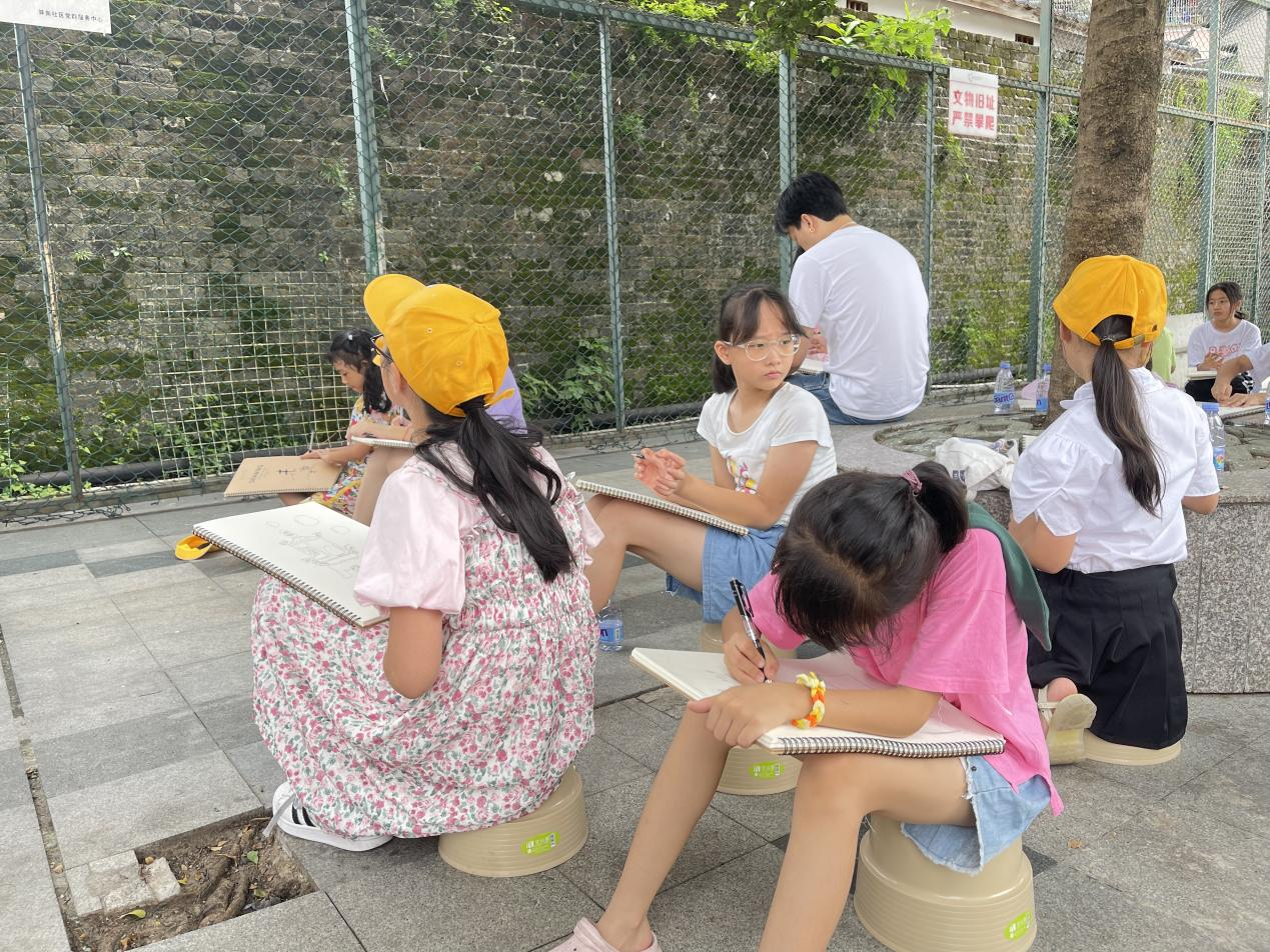 随后,美术老师带领青少年继续上节课的写生,以实地写生的方式记录下他们所见所闻。他们将自己的感受和对这些地标的理解通过画笔表达出来,形式各异的作品展示了每个人独特的视角和触动心灵的情感。同时,青少年顶着滚烫的太阳积极热议讨论采访稿内容,下一次他们将对社区长者进行采访,为社区的发展变化做着全方位的调查。