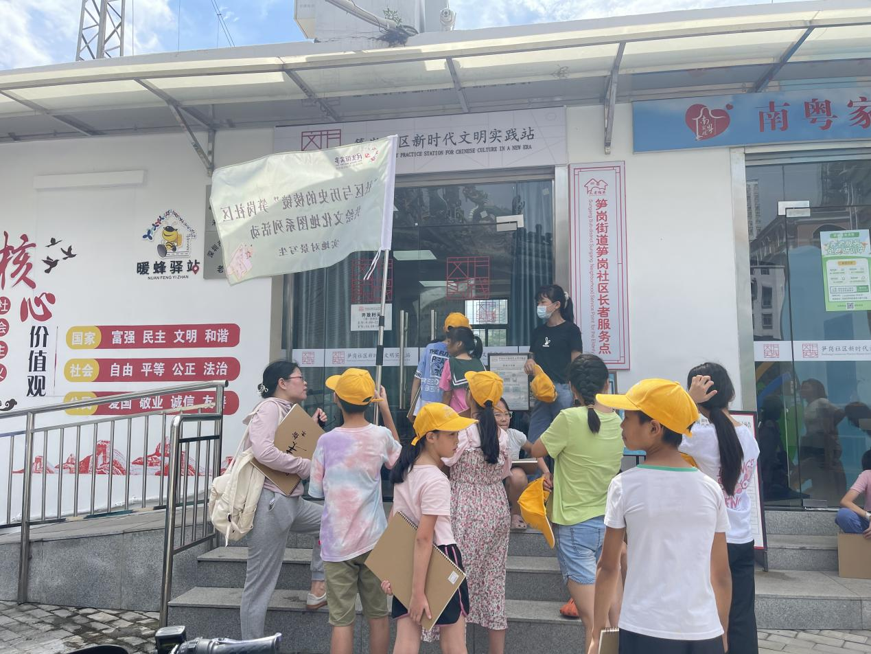 本节课将继续深入了解笋岗村的历史和发展,讲解员继续引导,带领青少年深入了解笋岗村的历史地标,聆听着讲解员生动详实的介绍。讲解员耐心讲述了历史变迁,以及与之相关的文化和传统。同时对青少年提问,个人对历史地标的认识以及小时候的印象故事,青少年们驻足倾听,被这些故事深深吸引。青少年通过讲解员解说与回忆过往,与社区的历史和文化产生更深层次的联系。