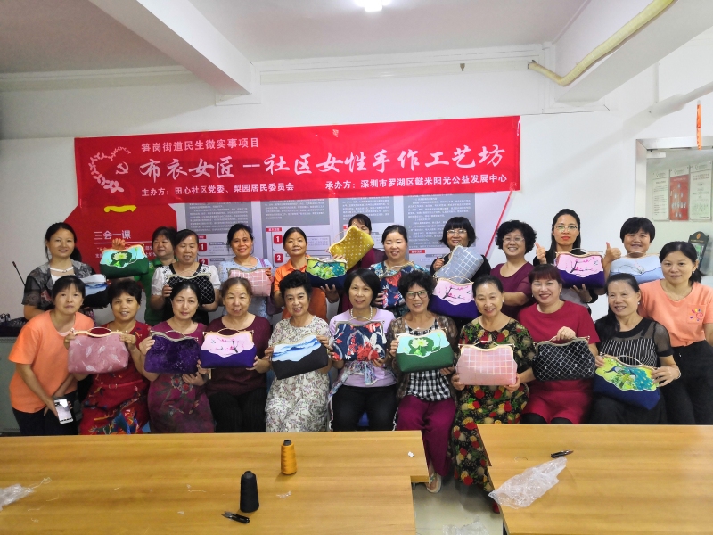 2019年8月7日上午9:00~12:00由田心社区党委、梨园居民委员会办主办,深圳市罗湖区懿米阳光公益发展中心承办的笋岗街道梨园社区民生微实事项目“布衣女匠——梨园居民女性手作工艺坊”第八课精美唇形口金包,在田心社区党群服务中心举行。