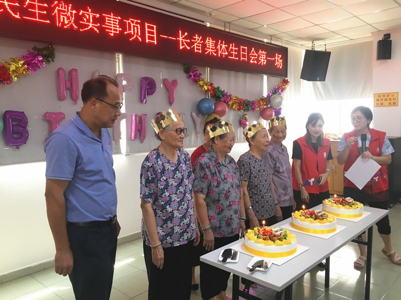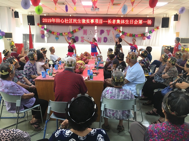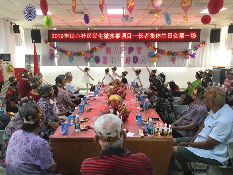 2019年9月18日下午在田心居委会二楼会议室开展田心社区民生微实事项目长者集体生日会第一场活动。生日会在主持人的祝贺词中开始了,长者们戴上生日帽,一起观看田心幼儿园学生的特色舞蹈表演节目和田心老年人协会精彩的文艺演出,表演结束后长者纷纷送上满意的掌声。随后,长者们一起唱起生日歌,主持人还邀请四位80岁以上的长者代表大家吹蜡烛、切蛋糕,活动工作人员纷纷为寿星们派发生日蛋糕,与此同时也为长者们送上生日的祝福和生日礼物。