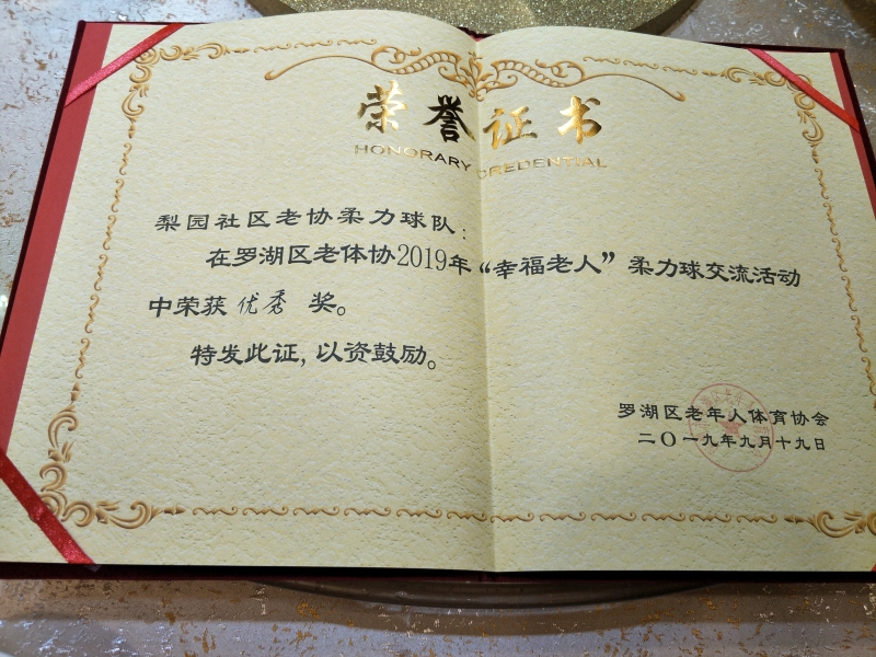 2019年9月19日,梨园社区老年人忇会在罗湖体育馆参加的,罗湖区老体协2019年“幸福老人”柔力球交流比赛中荣获优秀奖。