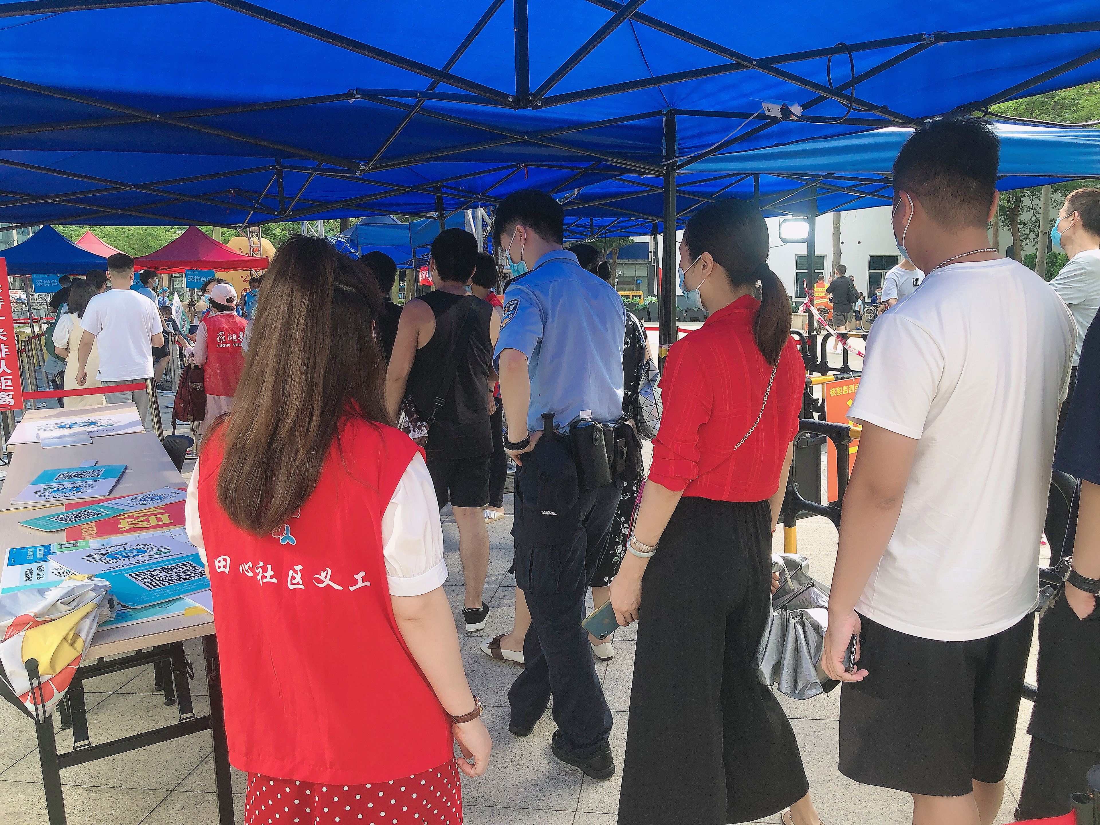 2021年6月26日,田心社区党群服务中心社工带领义工们前往初心公园、协助笋岗街道开展专项人员核酸检测工作。