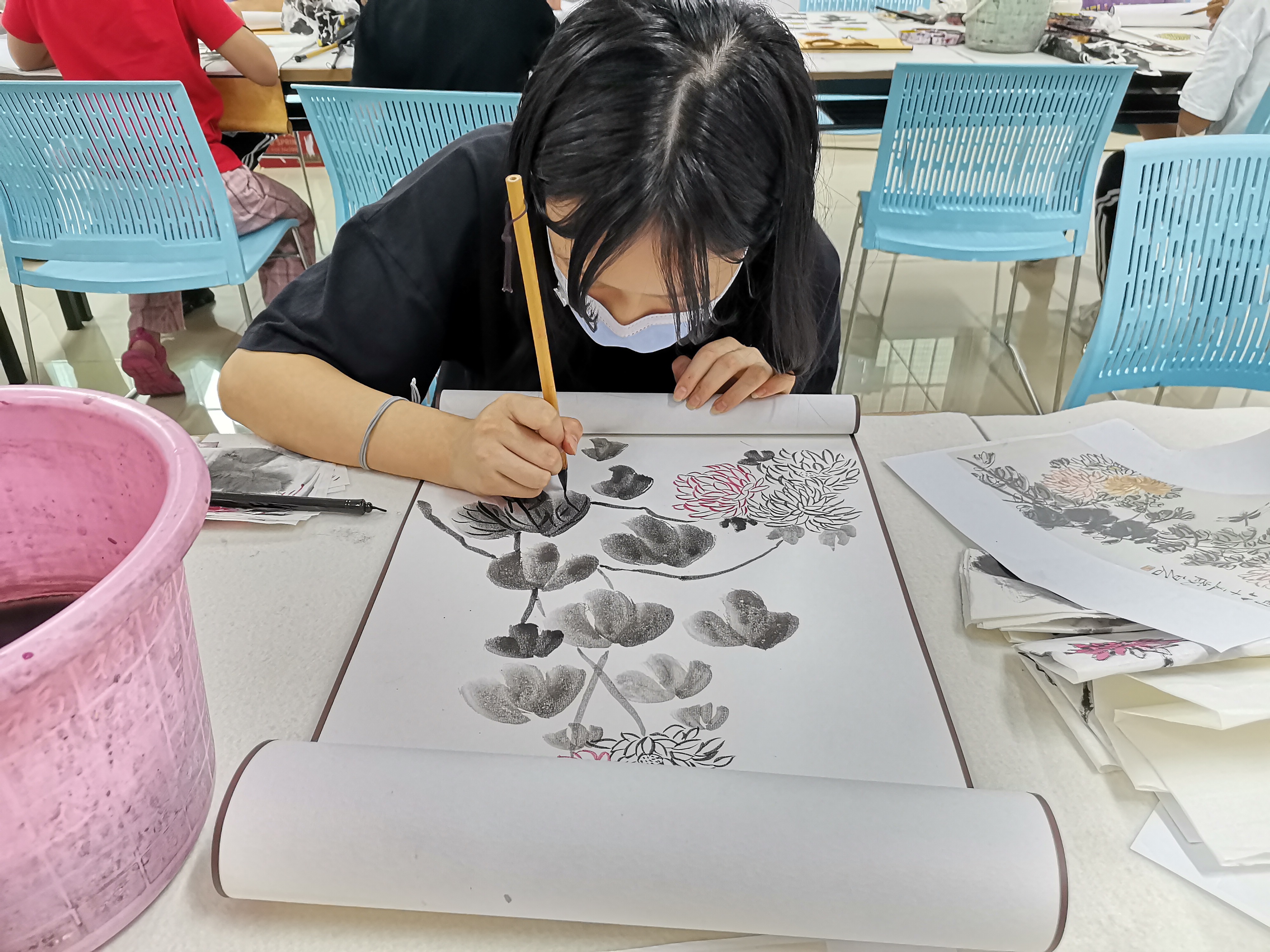 活动开始,工作人员以互动问答的形式,和大家讲解了毒品小知识,帮助青少年树立对毒品正确的认识,“老师,我知道!”青少年们一边认真思考一边争先恐后的向老师举手回答自己了解的“毒品”知识,现场学习气氛十分浓厚!接着,在国画老师的教导下,青少年们利用两支毛笔、一盘颜料、一桶清水等简单的工具,就将一朵又一朵形态各异、色彩绚烂的菊花“开”在了纸上!