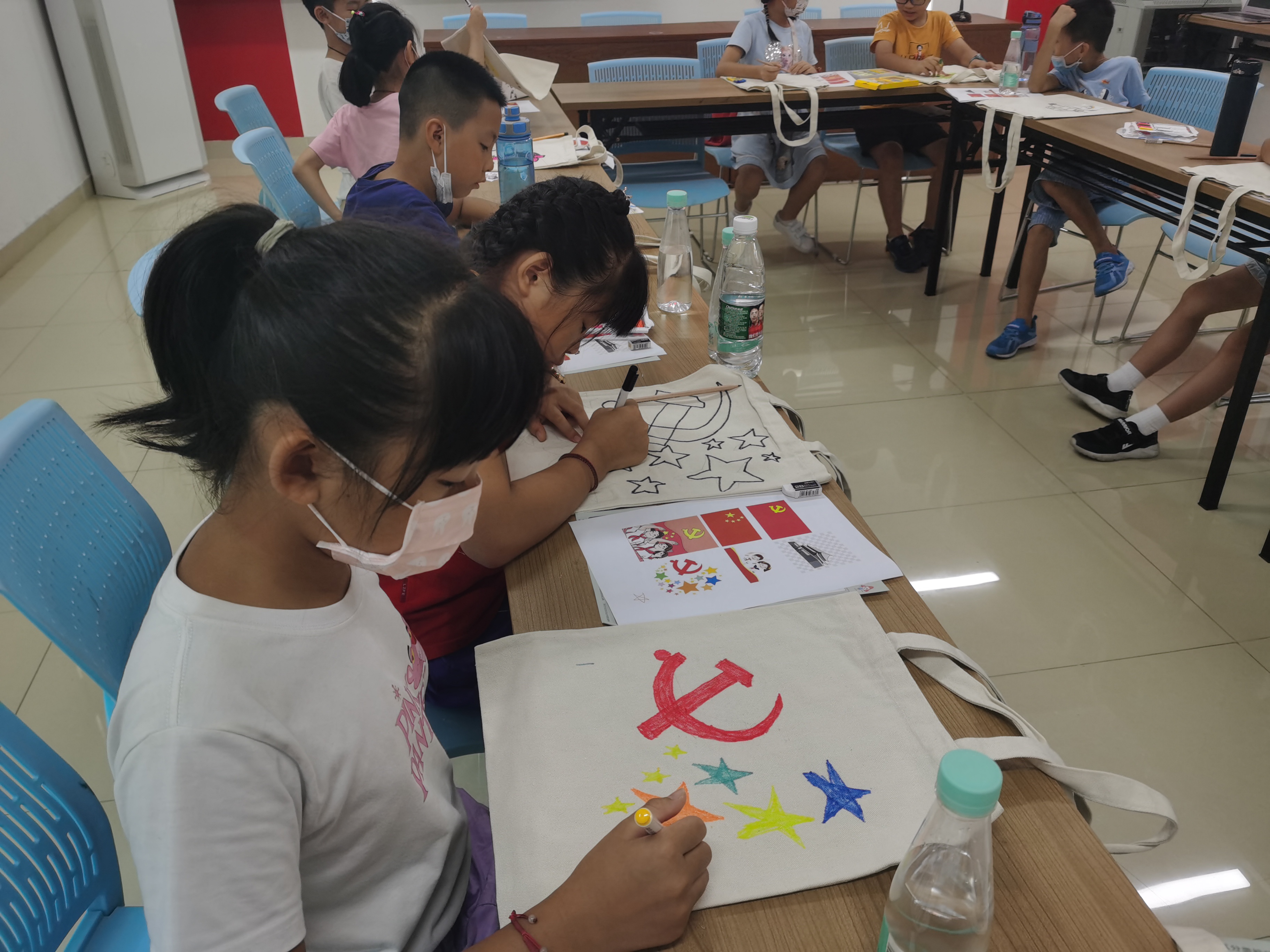 (罗湖家园网讯)为庆祝建党100周年,进一步加深儿童对党史的了解和认识,培养儿童从小爱党、爱国的思想情怀。2021年8月26日下午,在社区党委的领导下,田心社区党群服务中心开展了“童心向党,创意彩绘”田心社区青少年环保袋DIY手工坊,活动开始,社工先让大家观看红色主题微电影《追寻》,电影讲述了中国共产党建立的过程中艰苦与险阻,是无数的革命先烈的鲜血才换来祖国的繁荣与富强。观影结束后,社工将环保袋制作的材料发给大家,向大家讲解了绘画方法及步骤。接着,大家就开始在环保袋上进行创作,用彩色笔细致而认真地在图形轮廓里填上自己喜欢的颜色,逐步勾精美的图案。经过1小时的绘画,一幅幅鲜艳多彩的绘画呈现在我们的眼前,活动现场气氛十分活跃,大家都对自己的作品非常满意。