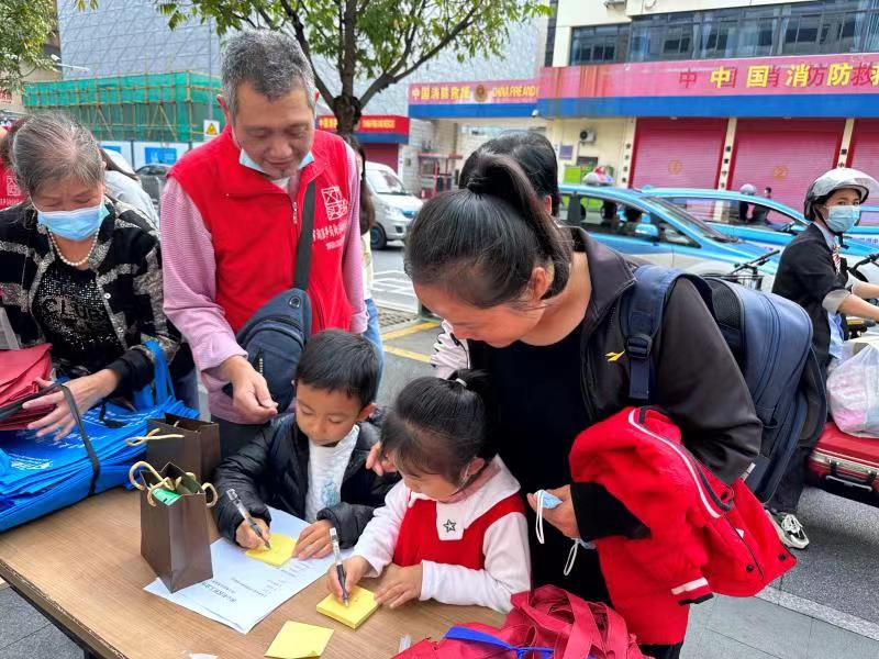 为了更好地宣传社工服务,提升社会工作服务的知晓度,活动中社工们一边向居民发放社工宣传折页,一边为他们详细介绍社工职能及服务内容。通过现场小游戏及知识问答等方式,向居民普及“社会工作是一种什么活动?”“社工能提供哪些服务?“社会工作的服务对象是哪些人”等社工知识,通过简单易懂的问题让居民了解到“社工”这一职业,充分达到宣传社工的目的。现场还设置了社工留言板“你想对社工说”,收集社区居民对于社工想说的话以及想表达的建议等。走近辖区老人、儿童青少年,向老人儿童青少年发放宣传册,普及消防安全、反诈骗常识,提升社区一老一小幸福感。此外,通过活动展板向居民宣传长者、妇女、青少年及志愿者等服务领域的服务活动。同时,为营造社区“志愿为人人,人人来志愿”的良好氛围,社工进行社区志愿者招募宣传,鼓励居民加入社区的志愿大家庭成为志愿者,共同参与社区治理。