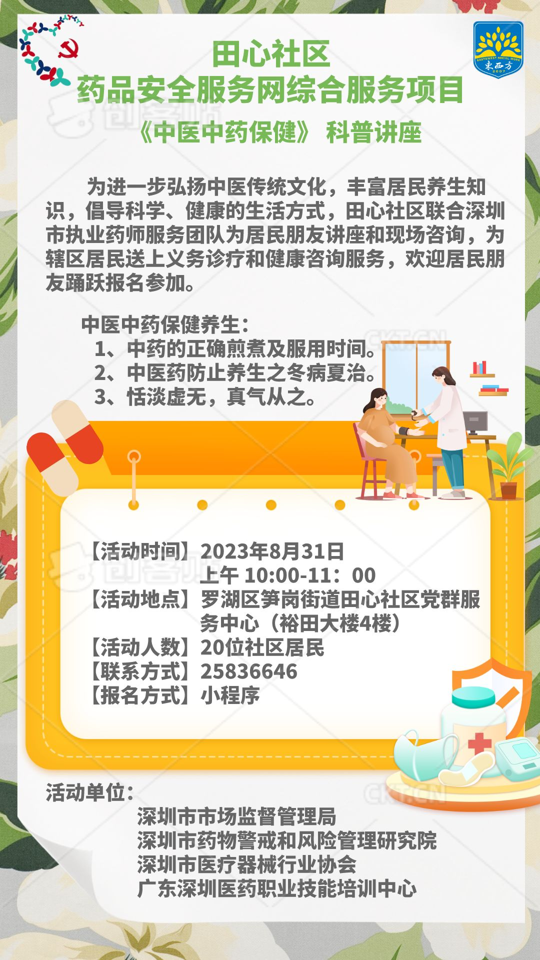 为进一步弘扬中医传统文化,丰富居民养生知识,倡导科学、健康的生活方式,田心社区联合深圳市执业药师服务团队为居民朋友讲座和现场咨询,为辖区居民送上义务诊疗和健康咨询服务,欢迎居民朋友踊跃报名参加。