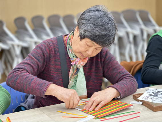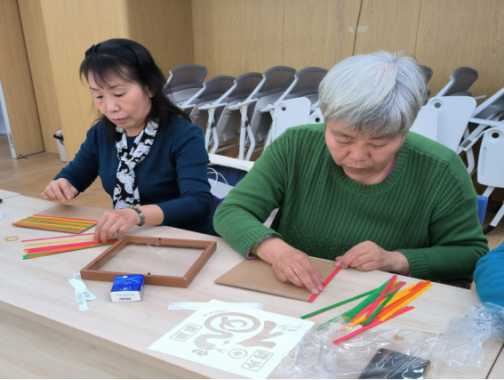 在社工的指导下,居民学习编织技巧,纷纷动手实践起来,先对竹篾,方框,贴纸等按照指导分类,并按自己的喜好将彩色的竹篾粘在背板上,耐心地将竹篾逐一放置,并按一挑一压的方法贴上间隔较宽的竹篾,同过调整横条竹篾的间距完成了色彩鲜艳的底板。在他们的认真制作中,色彩斑斓的竹编画便展现在大家面前,有的是“吉祥如意”四个字,代表了深深的祝愿;有的是可爱的财神宝宝,为大家带来财源滚滚;还有的则是栩栩如生的“金蛇”,为2025年带来金蛇赐福……居民们通过自己的双手,表达人们对元宵节到来的欣喜。最后,在轻松愉快的气氛中,大家用合影记录了此次快乐的瞬间、用微笑展现未来的美好憧憬。