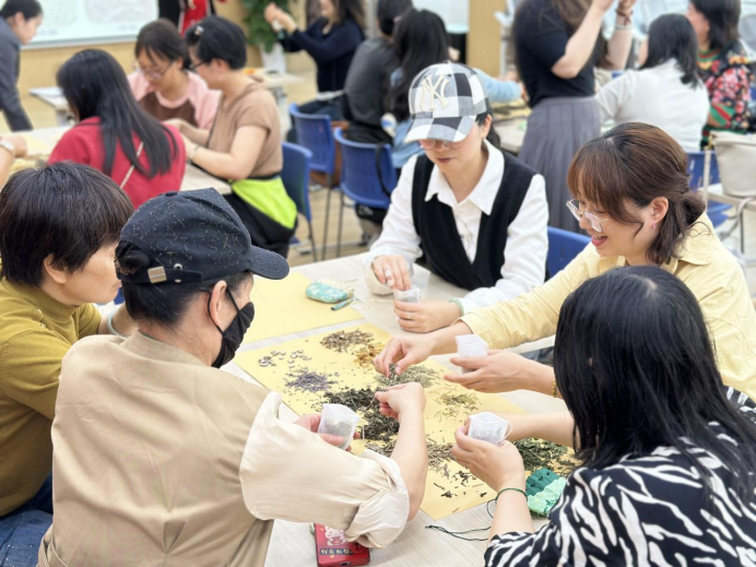 分组协作环节,从布料选择到药包装填,妈妈们迅速熟络,交流育儿经、家务巧思,欢声笑语不断。答疑解惑时段,老师穿梭其中,手把手纠正香囊填充、收口技巧,确保每位妈妈跟上节奏,失误时的安慰、成功时的夸赞,让课堂满溢温情。