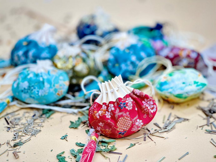 活动现场,各类精美的香囊材料率先映入眼帘,从古典花鸟刺绣到寓意吉祥的文字绣样,瞬间点燃妈妈们的创作热情。老师详细讲解香囊的历史渊源,从屈原时代的驱虫防疫寓意,到如今作为民俗艺术品承载的祝福情思。材料选取更是独具匠心,精选艾草、薰衣草等12种天然香料,搭配丝绸、棉布等质感布料,质感与芬芳兼具,让妈妈们指尖摩挲间感受传统与品质碰撞。