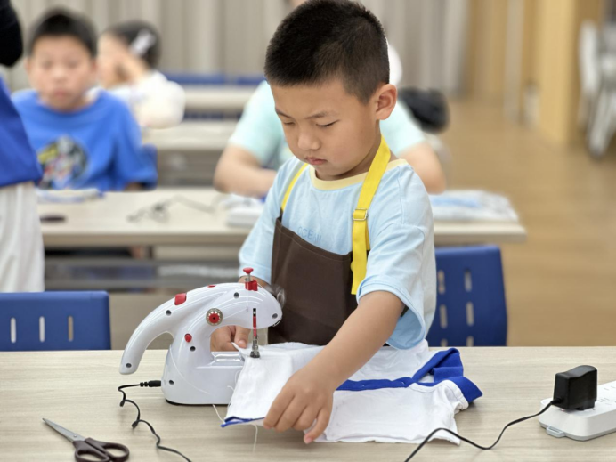 缝纫机缝制袋子环节更是将活动推向高潮,家长和孩子相互配合,在专业老师的指导下,小心翼翼地操作机器,将旧校服变成了实用又美观的袋子,真正实现了旧物改造,让孩子们体验到了从设计到成品的完整过程,感受到劳动带来的成就感。