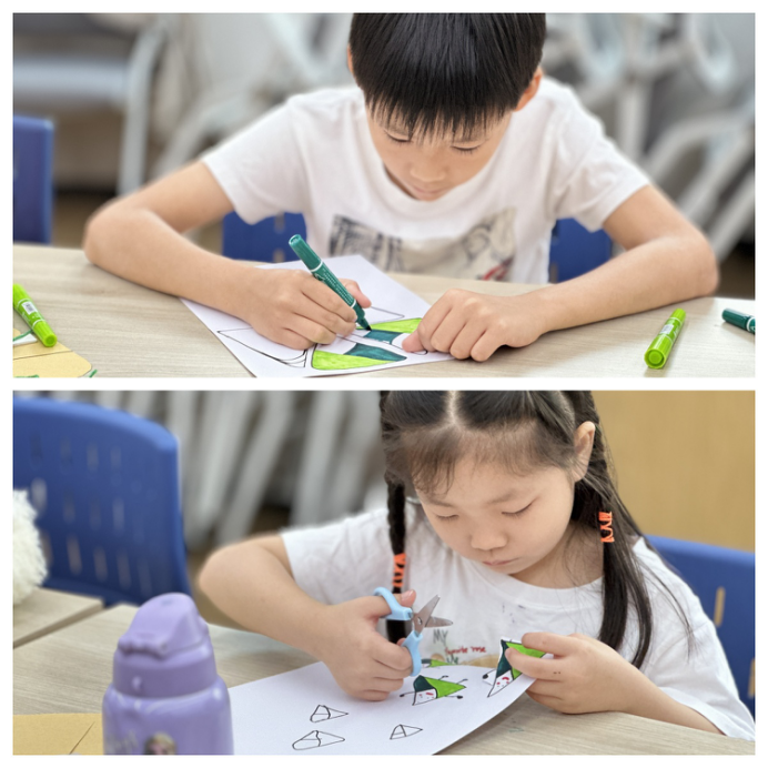 孩子们围坐在一起,相互交流绘画灵感和制作技巧。有的孩子在画粽子时,为粽子画上了可爱的表情;有的则给蒸笼设计了独特的花纹,有的给粽子添上衣服和头发。“会冒烟的粽子”手工制作将艺术与创意完美融合,从平面绘画到立体成型,每一个步骤都充满挑战与乐趣。经过一番努力,一个个栩栩如生、热气腾腾的“会冒烟的粽子”诞生了。