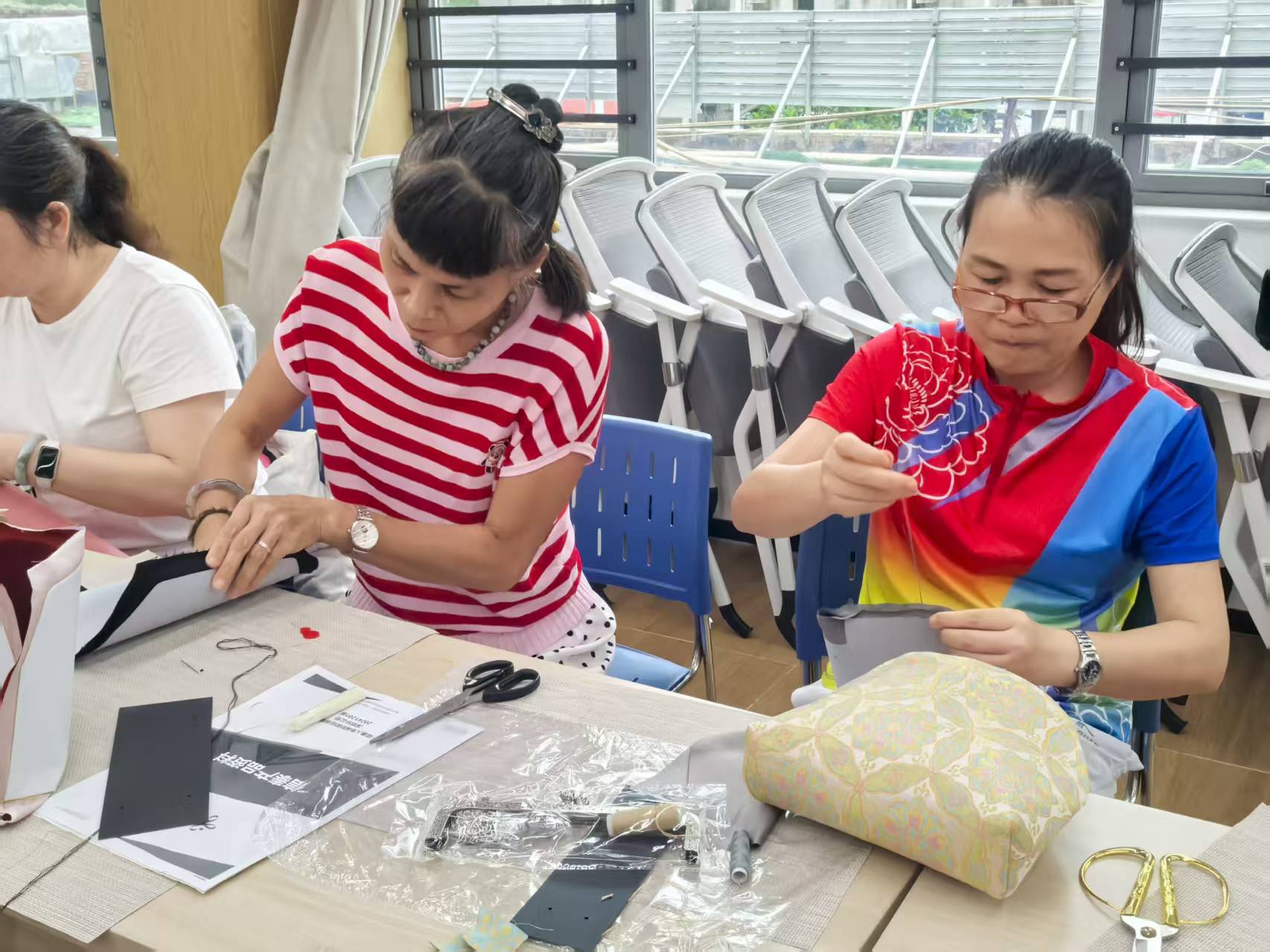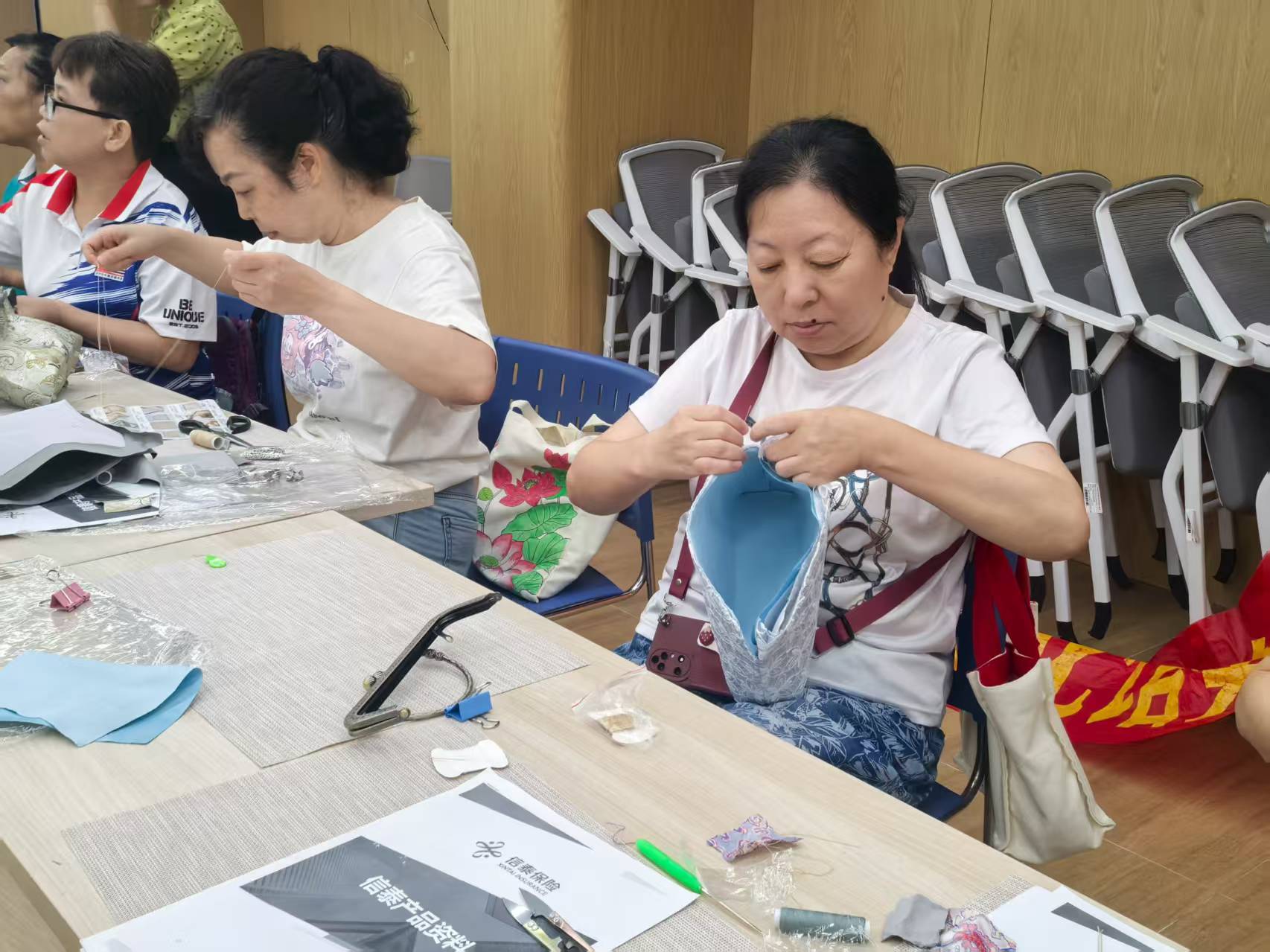 活动开始前,手工制作老师首先向大家详细讲解了手工袋的制作步骤,从布料的裁剪、针线的缝制技巧到图案的设计搭配,都进行了耐心细致的演示。老师边讲解边操作,“大家先把布料对折,沿着边缘缝起来,注意针脚要均匀……” 居民们听得聚精会神,不时拿出手机记录关键步骤,遇到不懂的地方及时向老师请教,老师也一一进行解答。