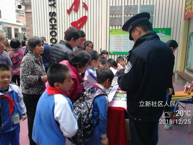 为进一步推进 “6.27”工程校园毒品预防教育宣传工作,提升禁毒知晓率,营造良好的无毒校园氛围,2018年12月25日下午,东门街道立新社区工作站联合校园警务室在人民小学开展“珍爱生命,禁绝毒品,拥抱健康,共创和谐”为主题的禁毒宣传进校园活动,通过悬挂禁毒宣传横幅、现场讲解毒品知识、仿真毒品展示、派发宣传折页及小礼品等形式,向人民小学学生及家长开展禁毒宣传教育活动。