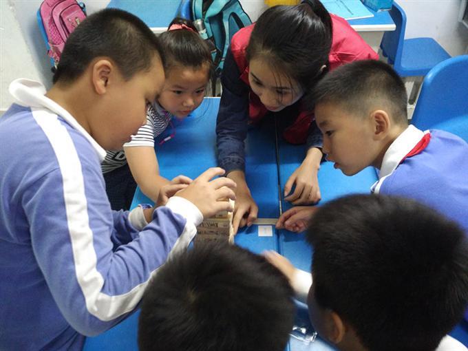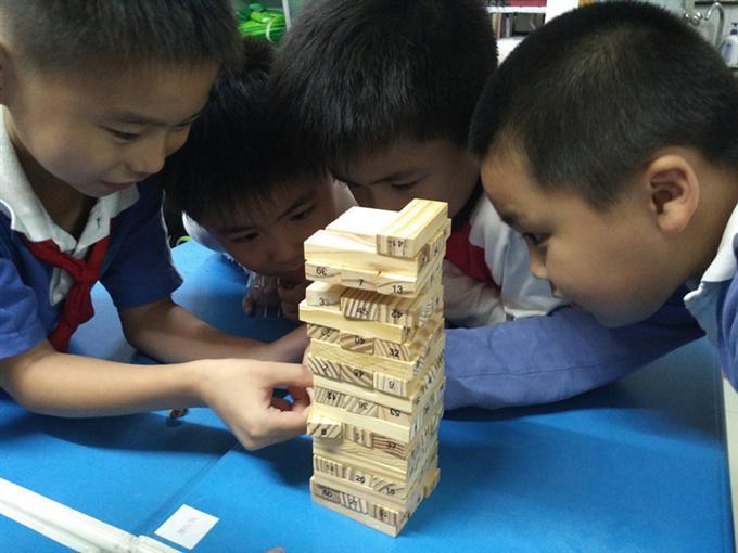 小学员们先是通过合作把游戏道具叠成高高的长方形木堆塔,保护好木堆塔是他们的使命。接着小成员们依次围成一圈,依照顺时针的顺序掷色子。每个成员把自己掷出的色子点数加起来,找出对应数字的道具,小心抽出,防止木堆跌落,导致木堆坍塌的成员接受小惩罚,为成员们朗诵古诗,或分享一个小笑话,或唱一首歌。小学员们屏气凝神,为完成自己的使命努力。PK如火如荼的进行着,输了的小成员也毫不吝啬为其他的伙伴献上自己的才艺展示。