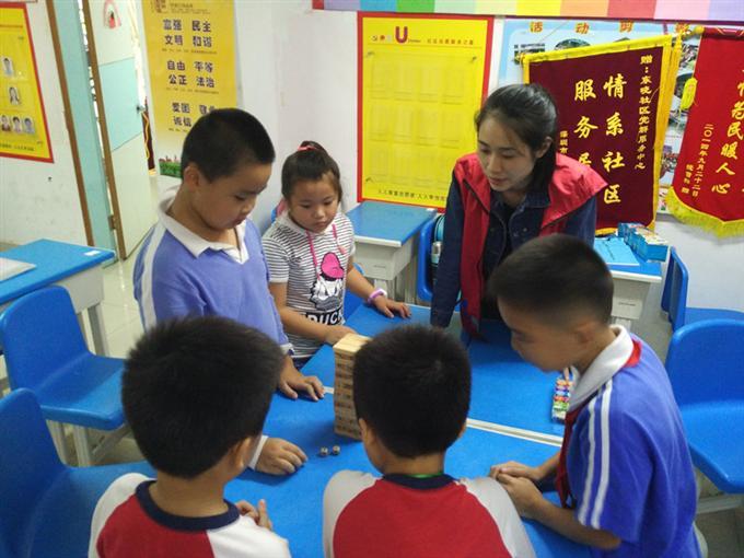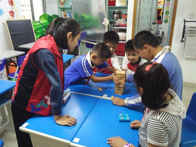 由于大部分四点半课堂的学员平常都忙于在自己的座位上完成作业,未能有时间与其他四点半课堂的小伙伴进行沟通互动。故通过开展叠垒乐桌游游戏,来增加彼此间的交流互动。