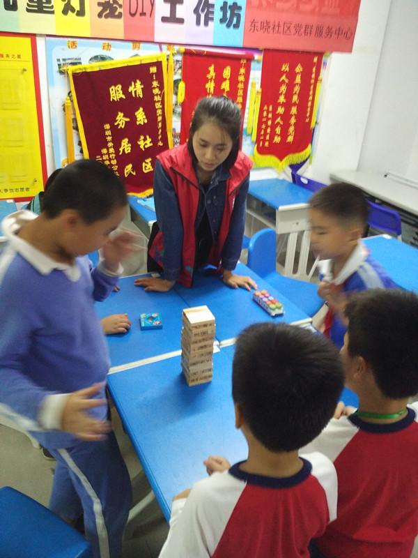 为给四点半课堂小学员一个轻松愉悦的假前预热时光,也为了增强学员们之间的相互交流 ,促进彼此间了解,增进彼此间感情,东晓社区党群服务中心的社工于2017年10月20日星期五下午在服务中心组织四点半课堂成员进行了叠垒乐桌游游戏。