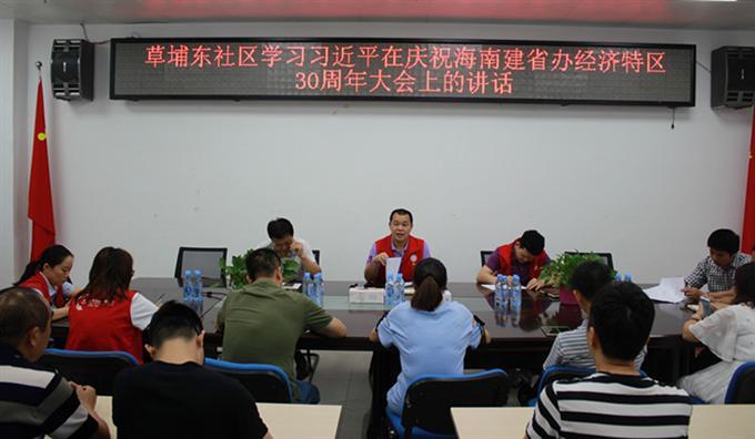 2018年5月4日,草埔东社区组织学习了习近平总书记在庆祝海南建省办经济特区 30周年大会上的讲话精神。会议指出,习近平总书记在重要讲话中明确了新时代经济特区的责任与使命,同时,也是对党员干部提出了新的要求,因此,社区党员干部务必要将习近平总书记讲话内容学深学透,并将其作为开展社区各项工作的指引。